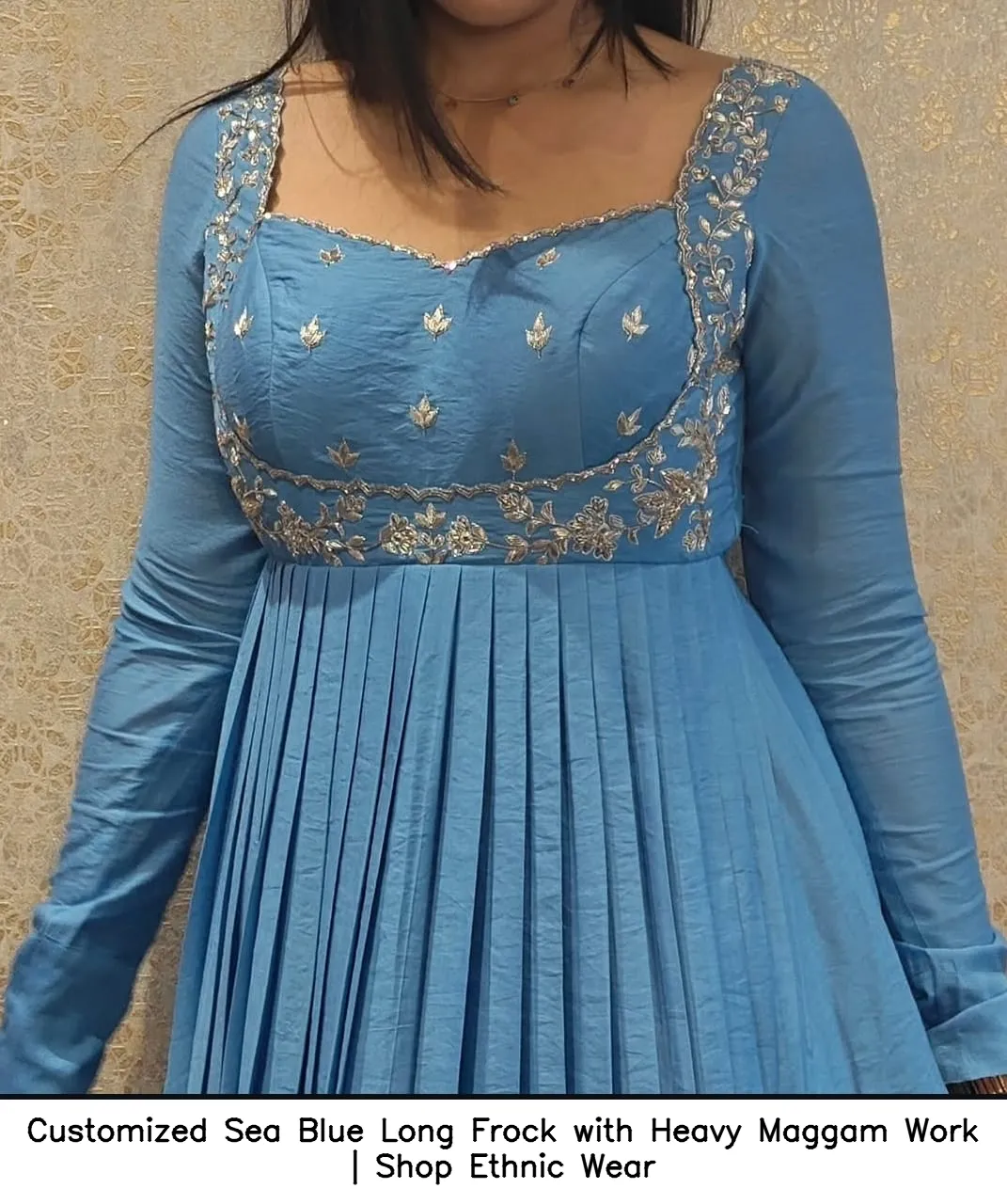 Customized Sea Blue Long Frock with Heavy Maggam Work | Shop Ethnic Wear is the perfect addition to your wardrobe. This stunning frock combines elegance with tradition. Moreover, the intricate maggam work enhances its beauty, making it ideal for various occasions.