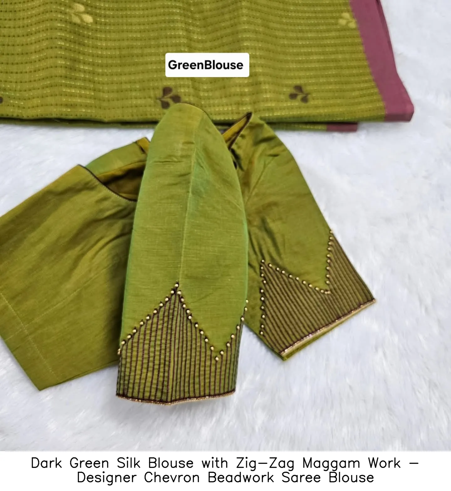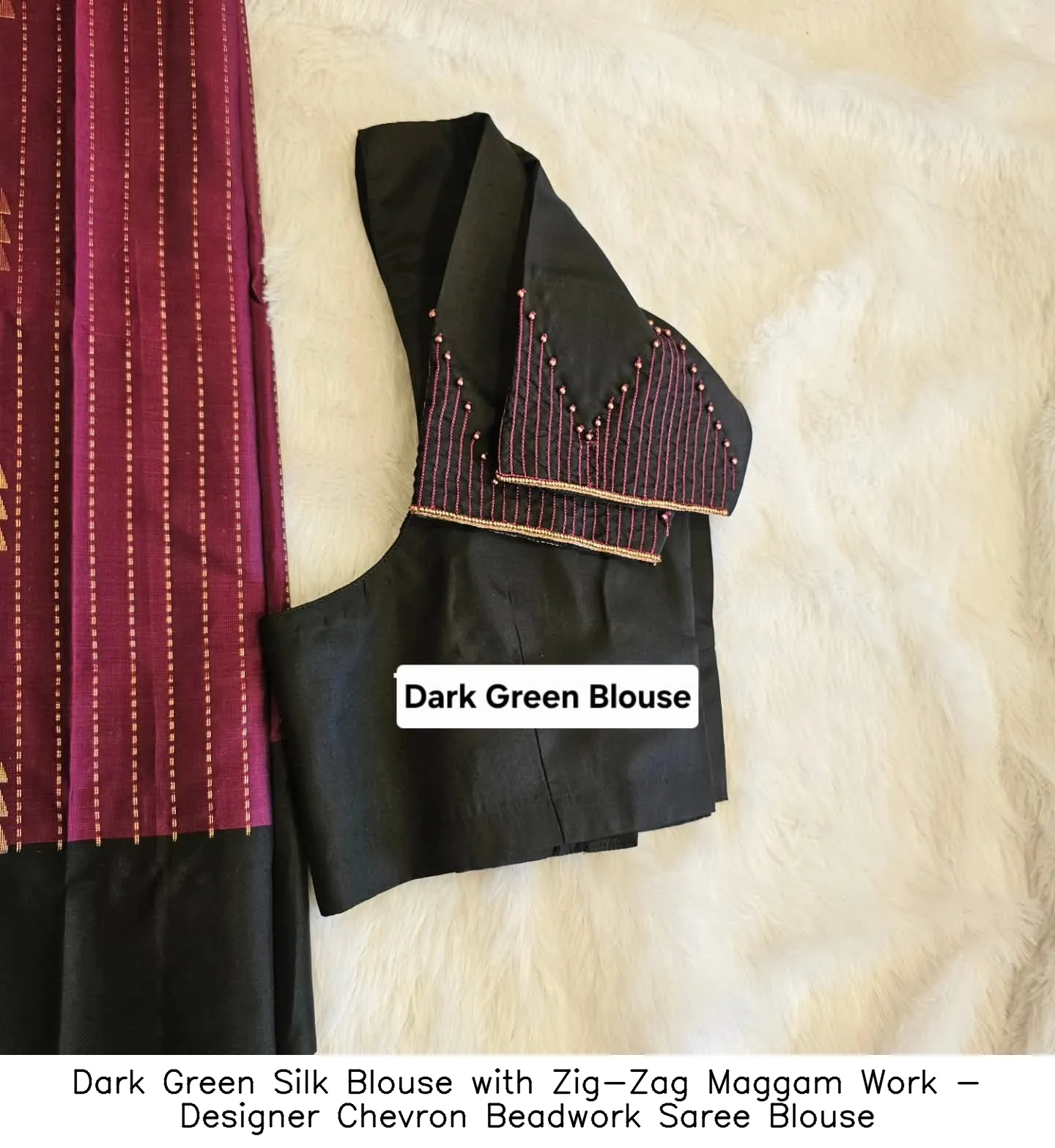 ​Dark Green Silk Blouse with Zig-Zag Maggam Work – Designer Chevron Beadwork Saree Blouse