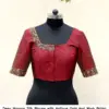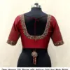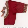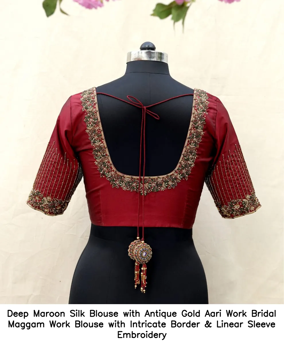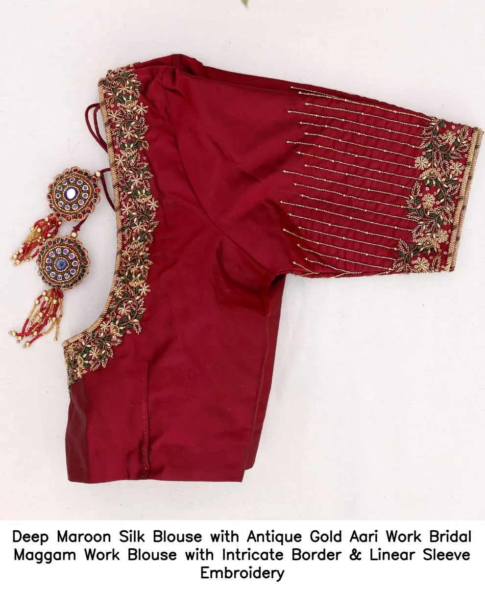 Product Name: ​​​Deep Maroon Silk Blouse with Antique Gold Aari Work – Bridal Maggam Work Blouse with Intricate Border & Linear Sleeve Embroidery