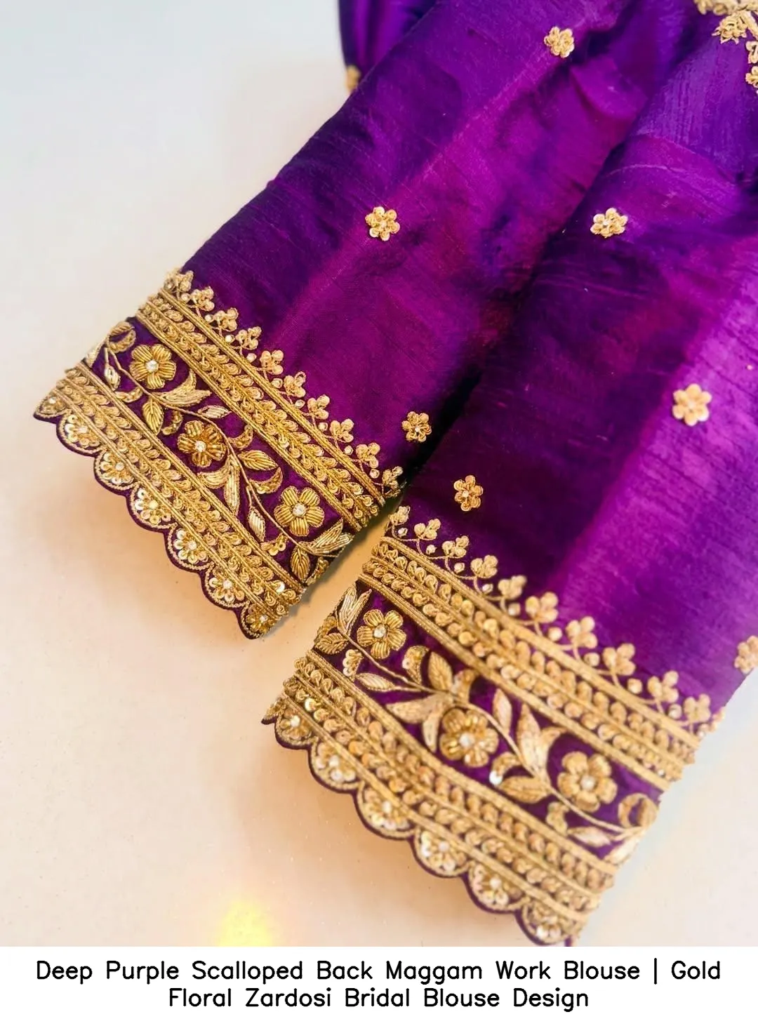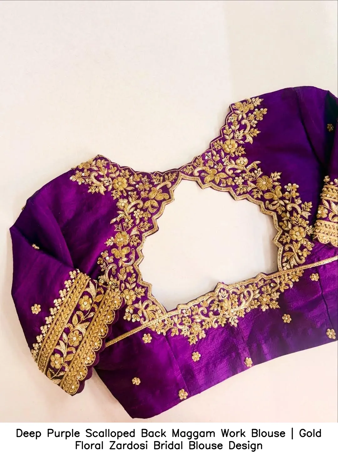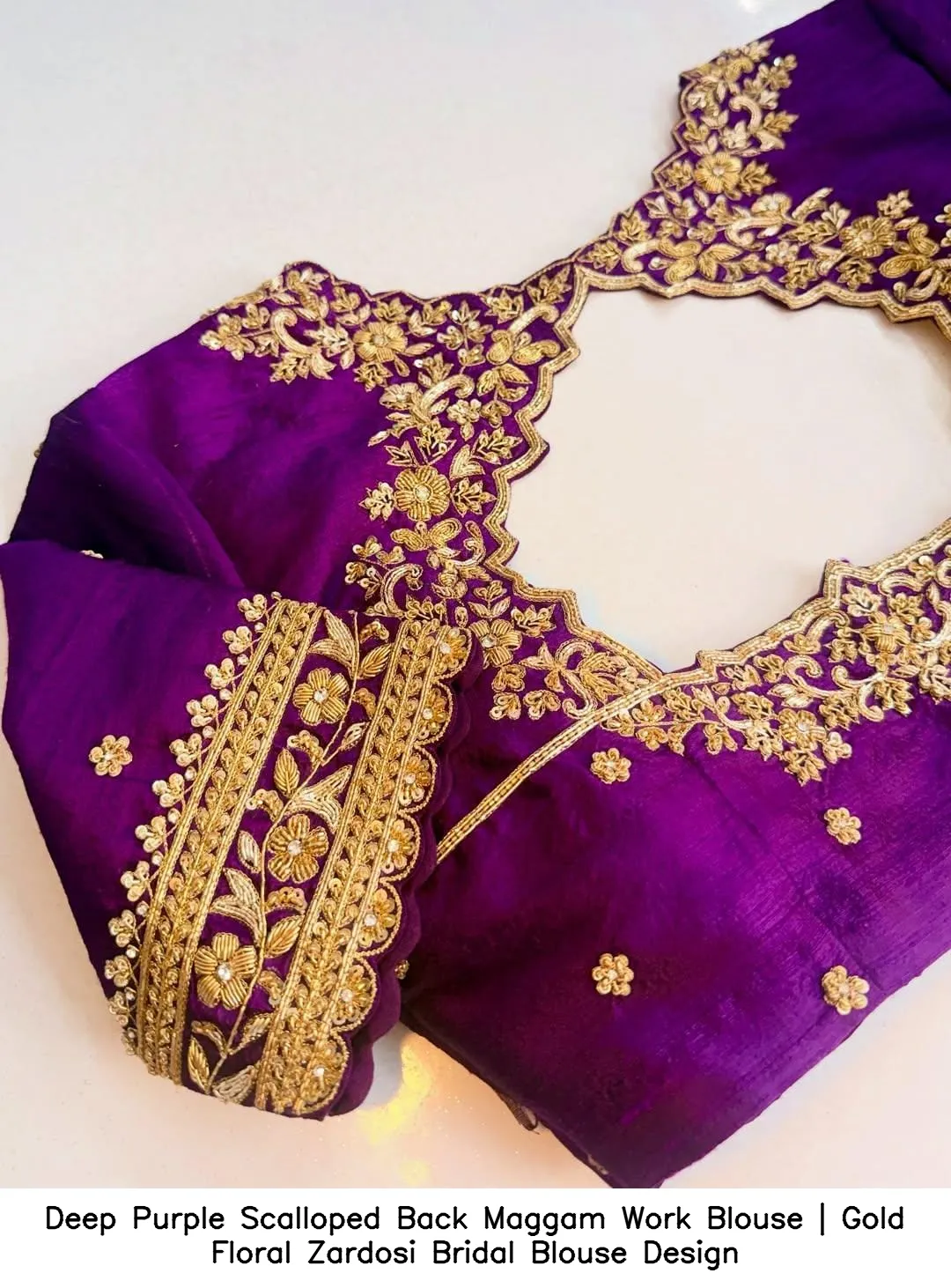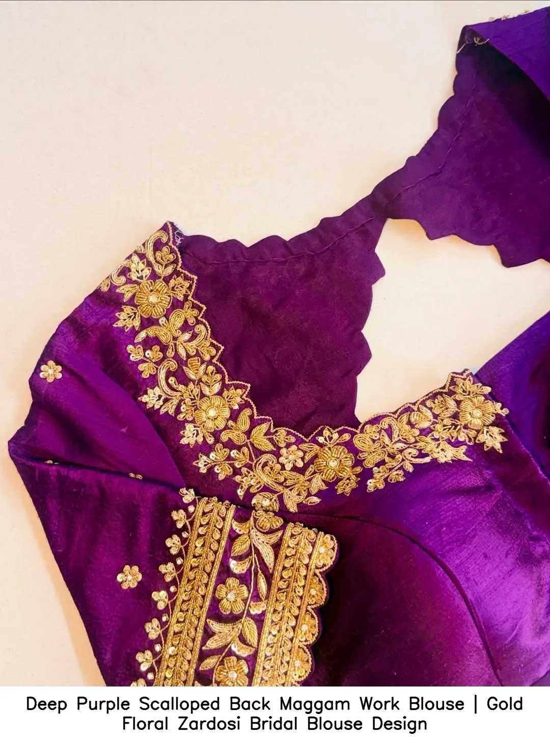 Introducing the exquisite Deep Purple Scalloped Back Maggam Work Blouse | Gold Floral Zardosi Bridal Blouse Design. This stunning blouse combines traditional craftsmanship with modern elegance, perfect for brides and special occasions. The intricate maggam work and golden zardosi floral patterns make this piece a must-have in your wardrobe.
