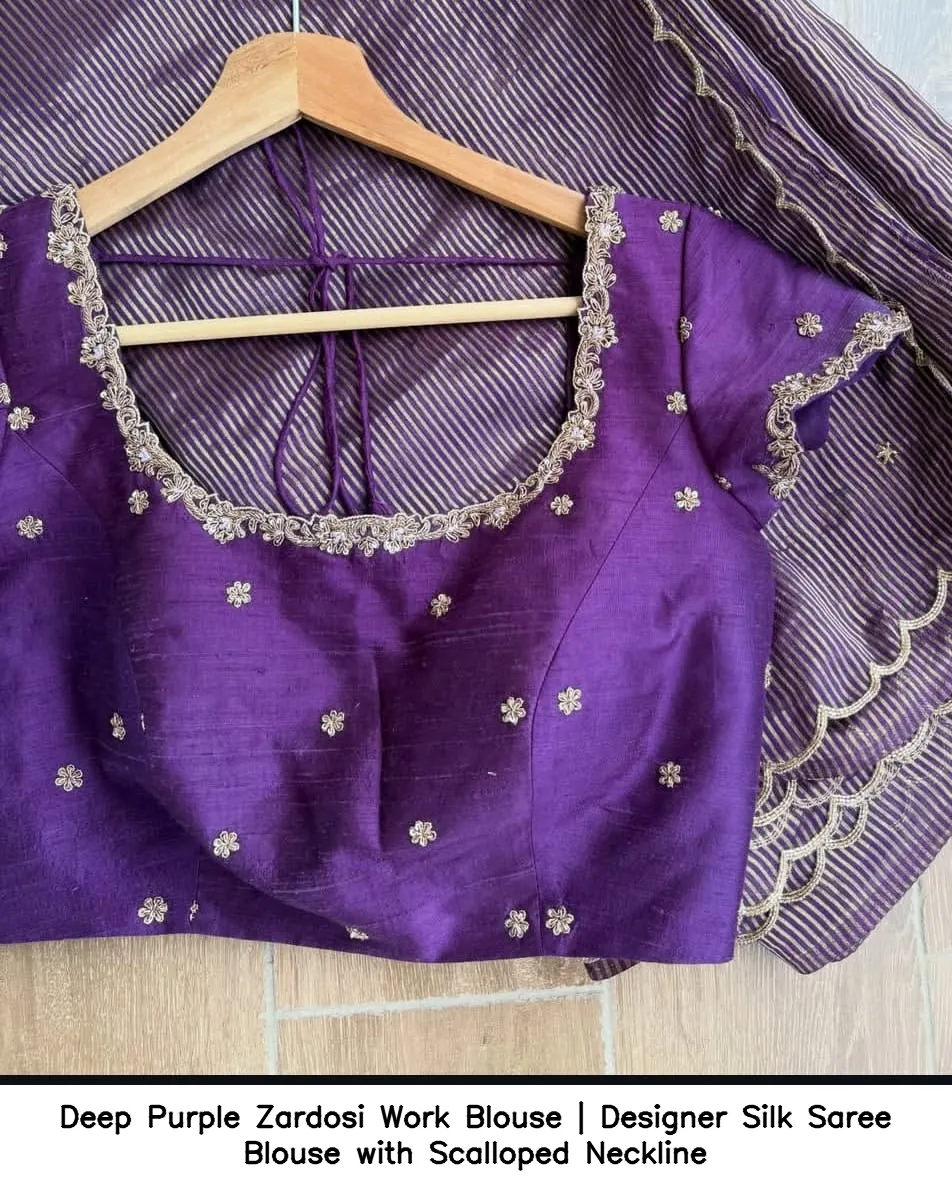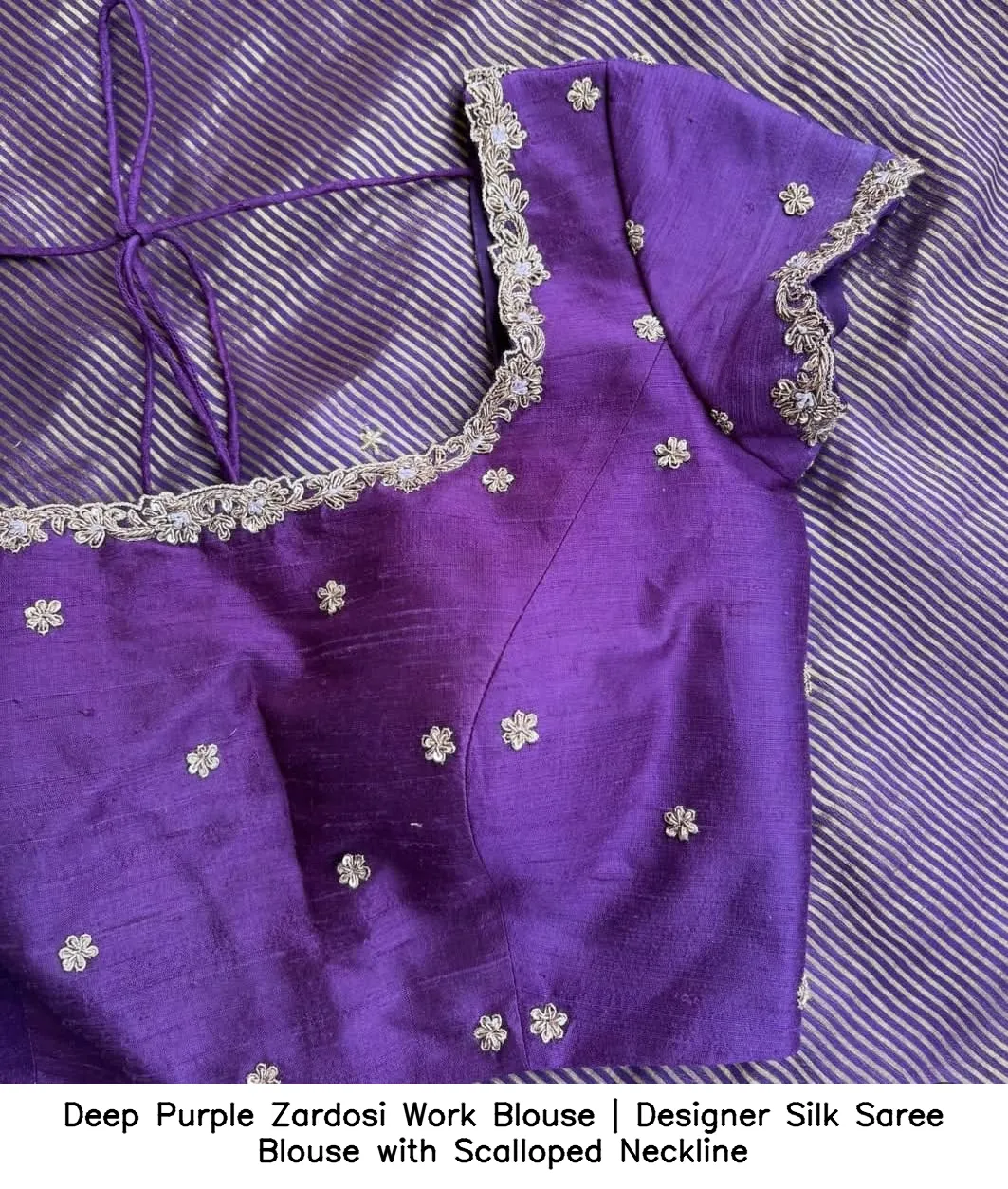 Deep Purple Zardosi Work Blouse | Designer Silk Saree Blouse with Scalloped Neckline