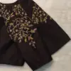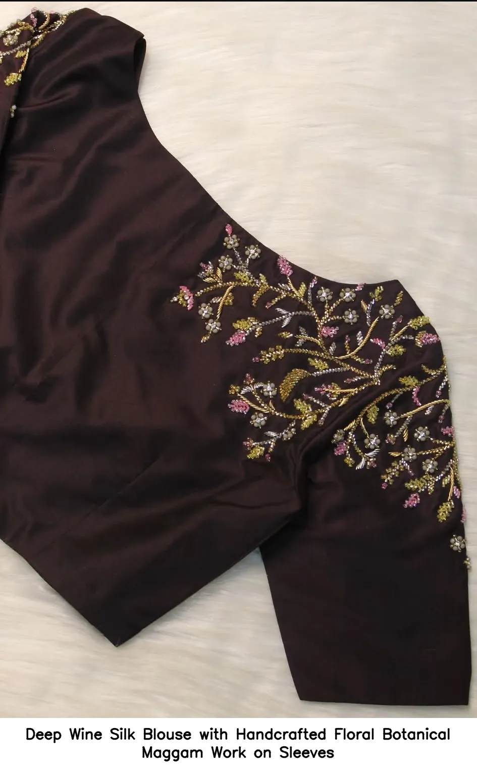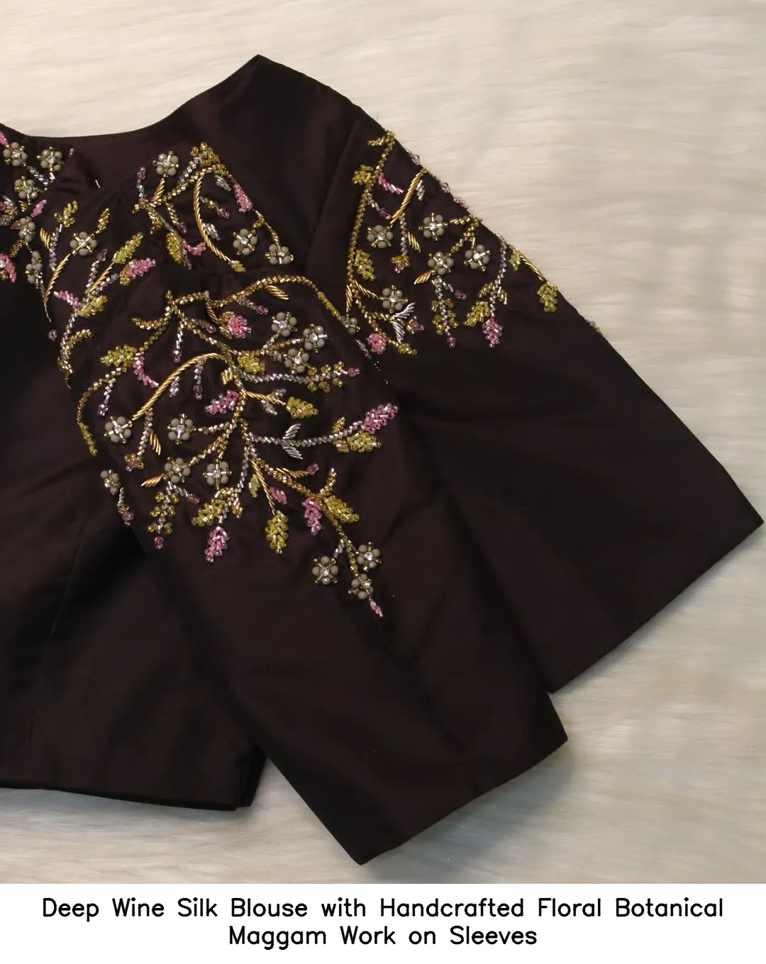 To maintain the beauty of your Deep Wine Silk Blouse with Handcrafted Floral Botanical Maggam Work on Sleeves, hand wash in cold water. Avoid using harsh detergents and direct sunlight for drying.
