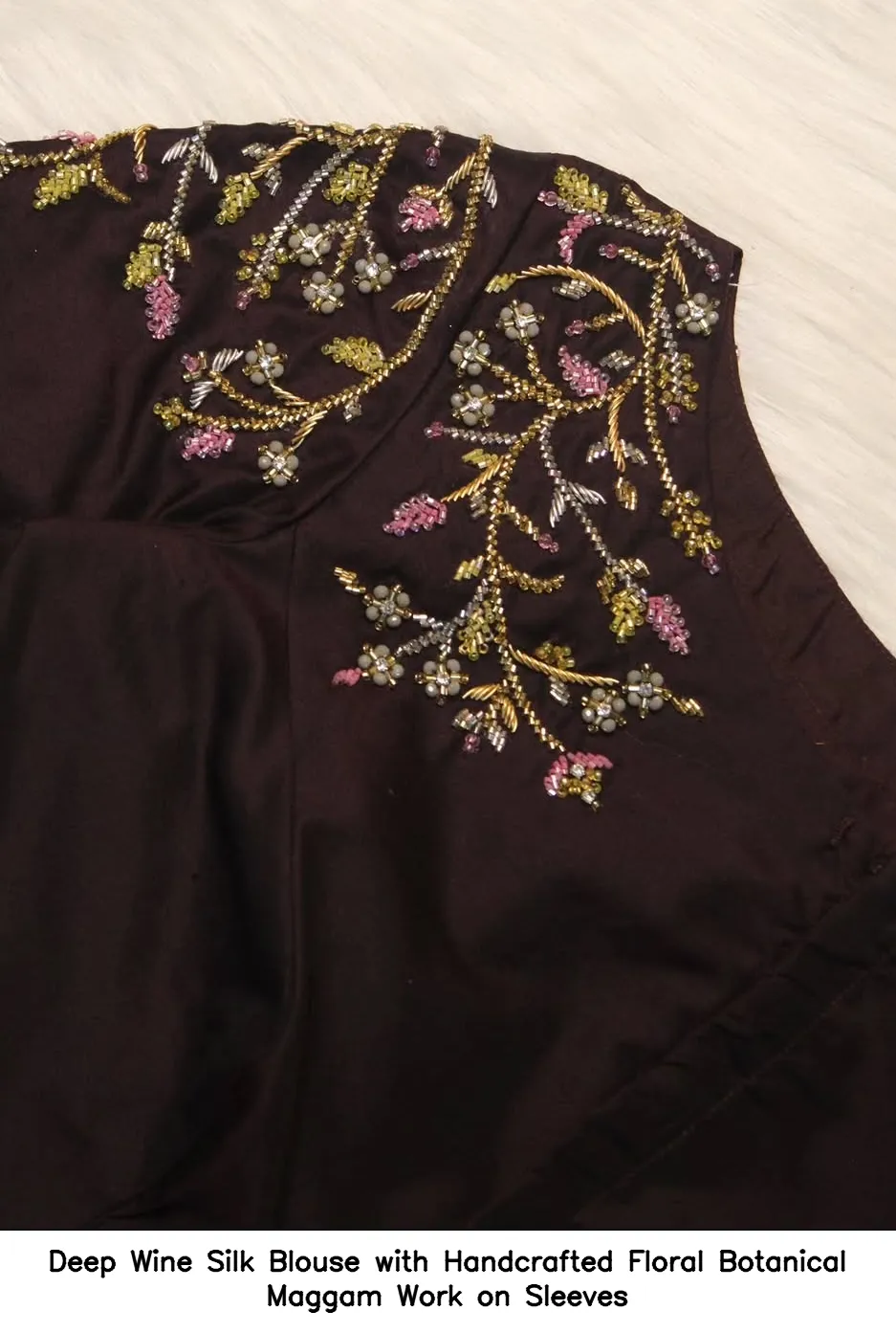 Deep Wine Silk Blouse with Handcrafted Floral Botanical Maggam Work on Sleeves