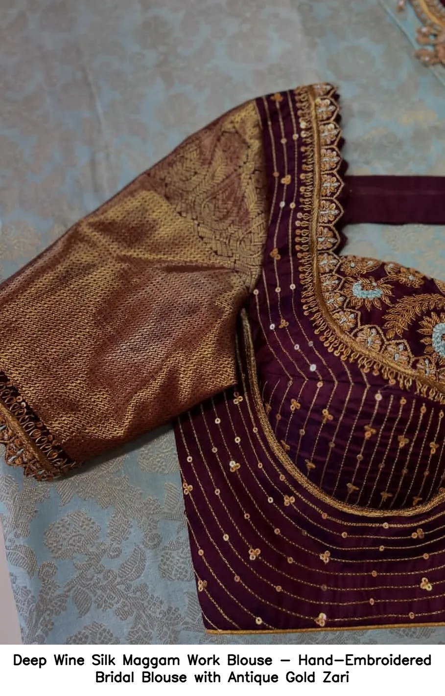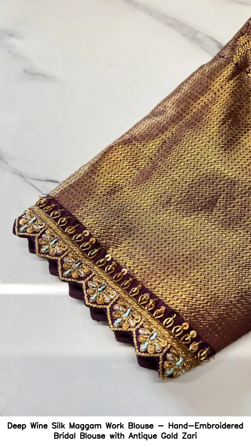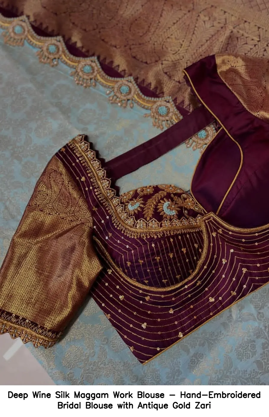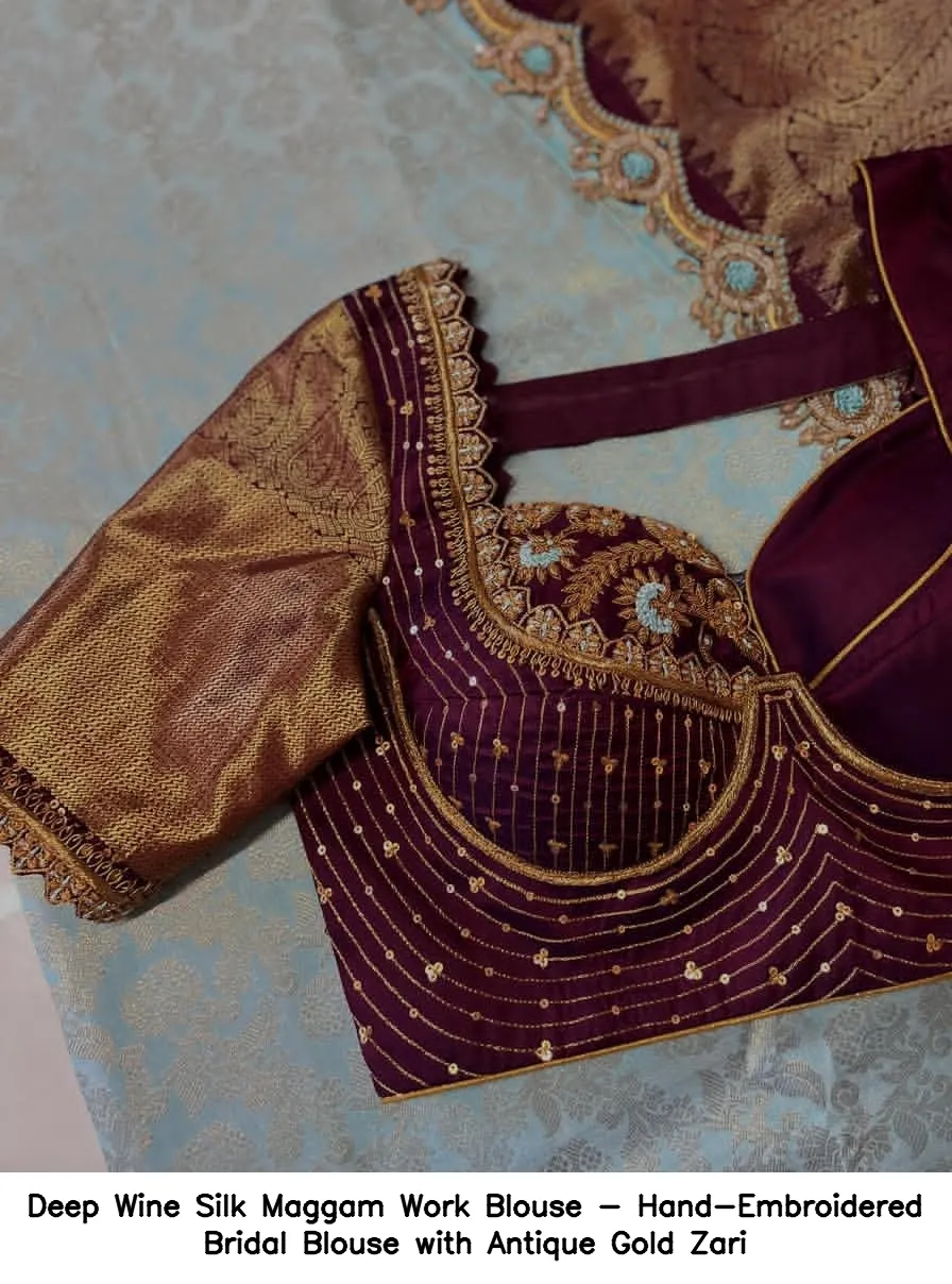 Deep Wine Silk Maggam Work Blouse – Hand-Embroidered Bridal Blouse with Antique Gold Zari