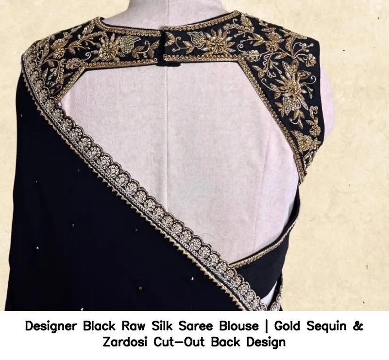 Why Choose the Designer Black Raw Silk Saree Blouse | Gold Sequin & Zardosi Cut-Out Back Design?