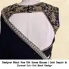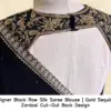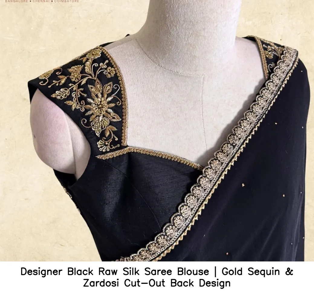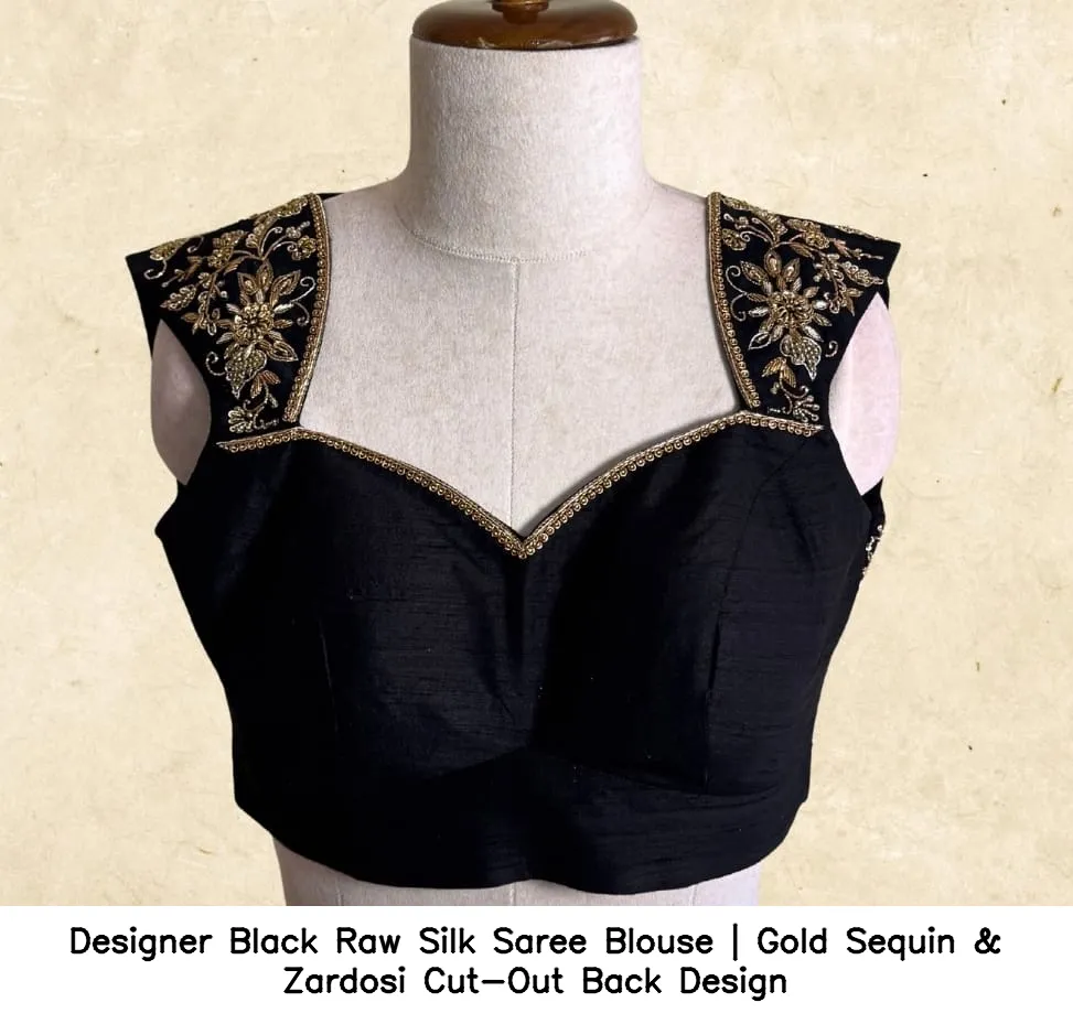 Product Name: Designer Black Raw Silk Saree Blouse | Gold Sequin & Zardosi Cut-Out Back Design