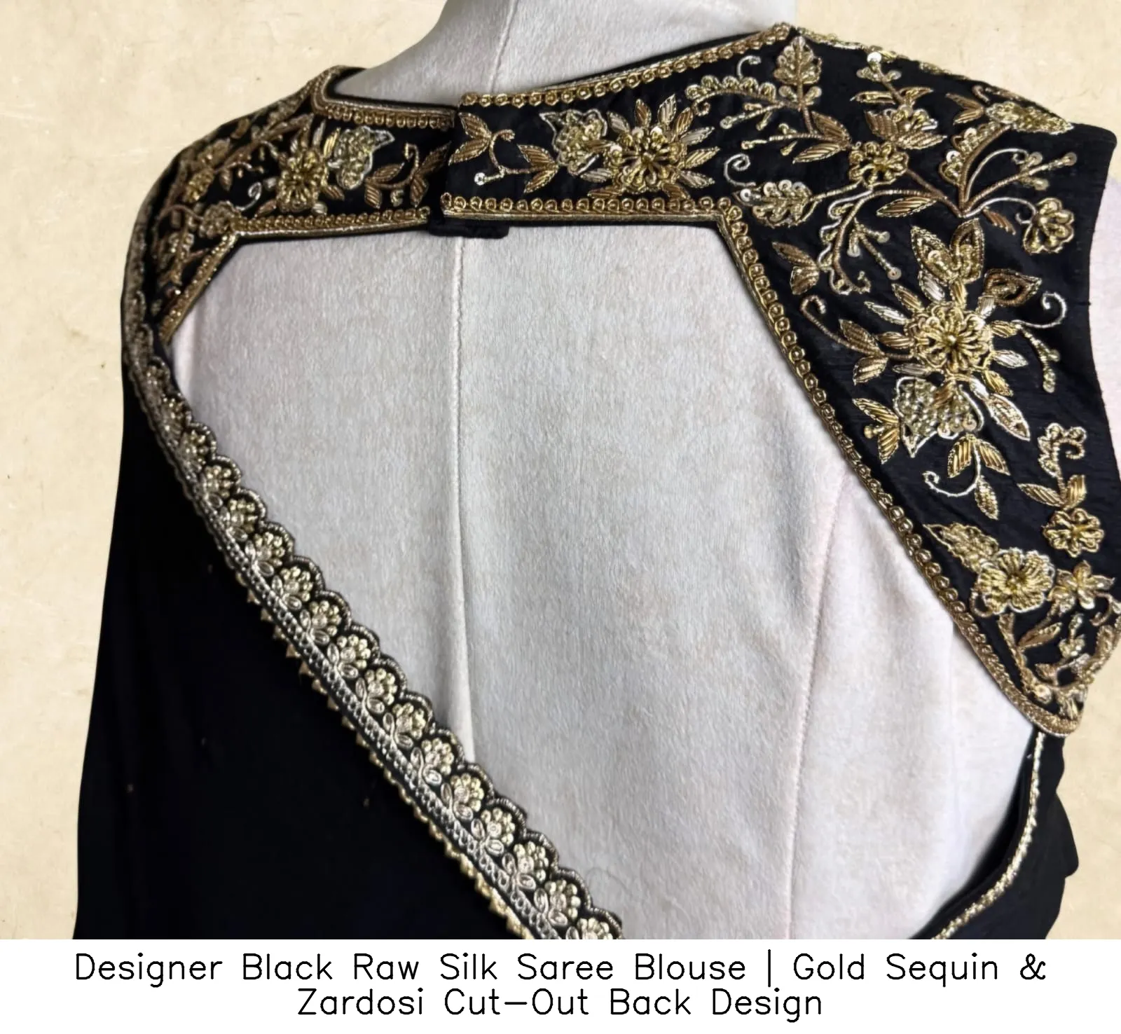 Designer Black Raw Silk Saree Blouse | Gold Sequin & Zardosi Cut-Out Back Design