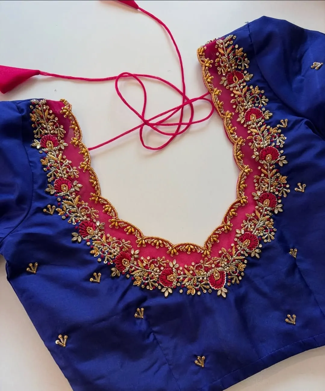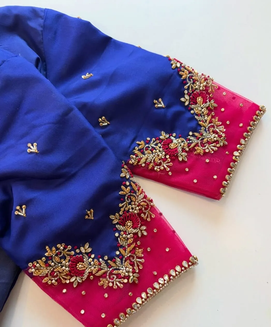 Designer Blue and Pink Net Blouse with Intricate Maggam Work Budget Friendly