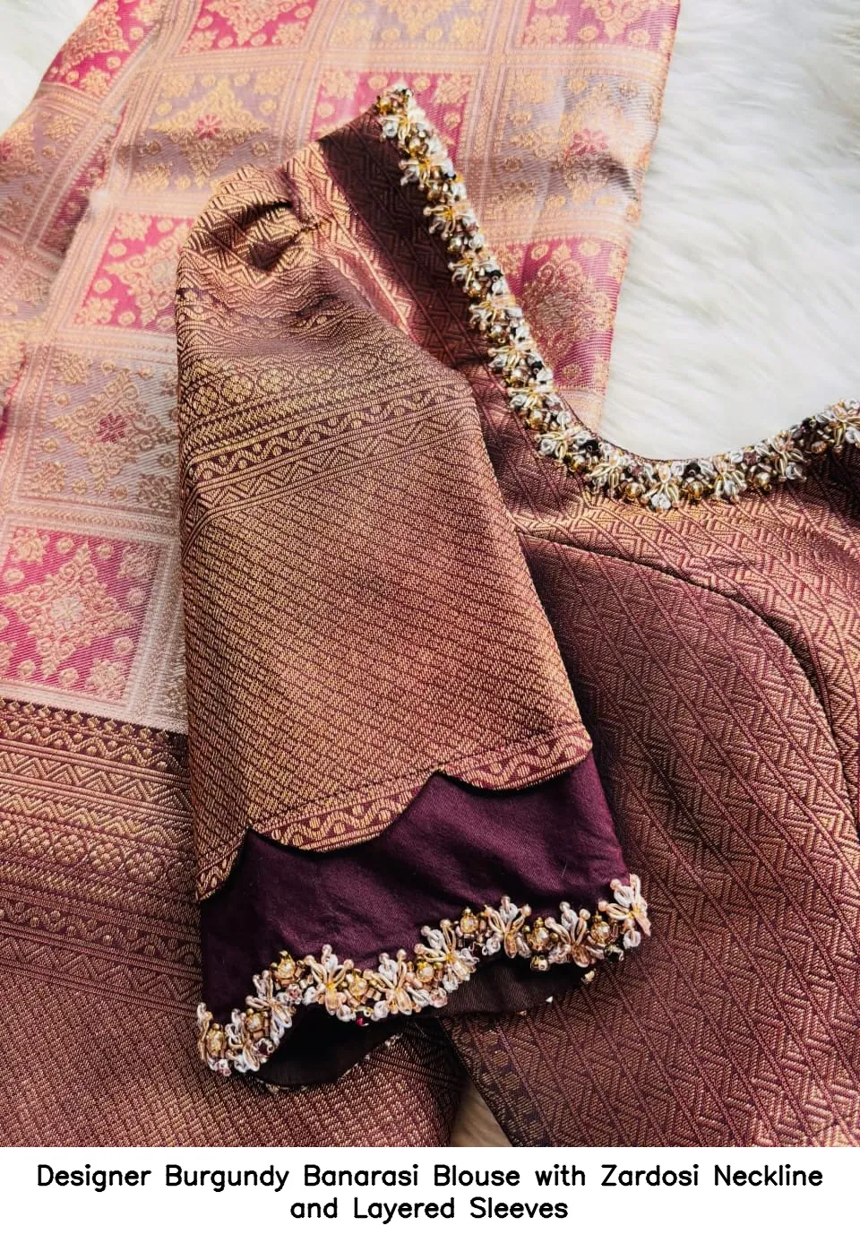 Product Name: Designer Burgundy Banarasi Blouse with Zardosi Neckline and Layered Sleeves