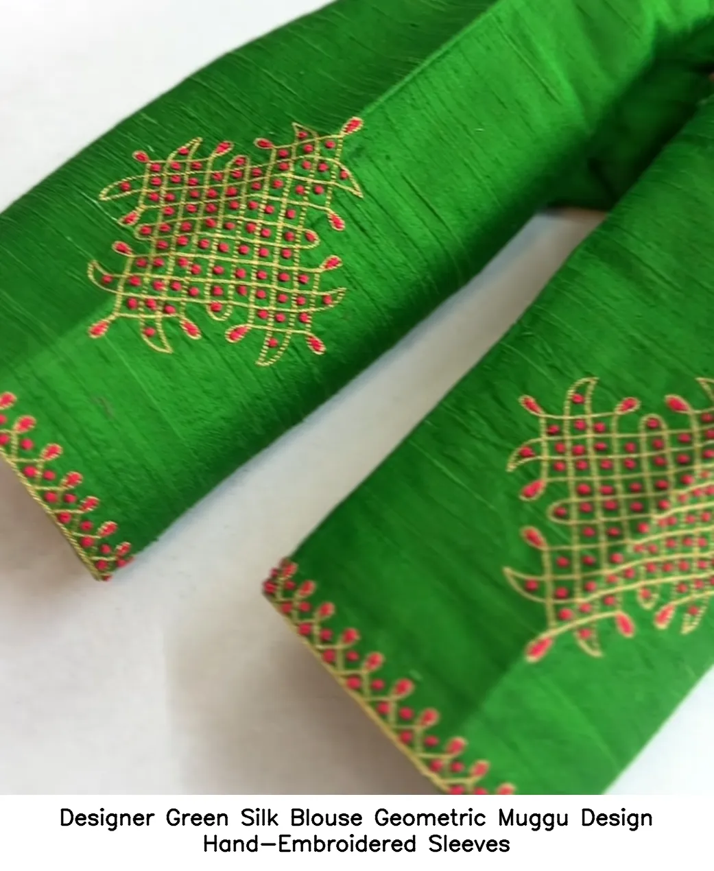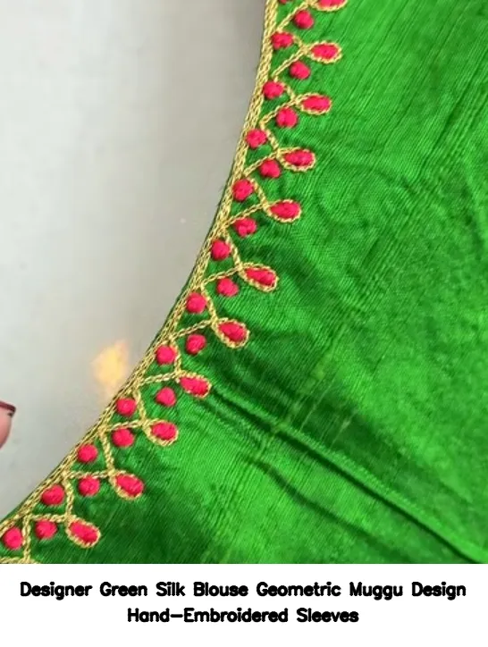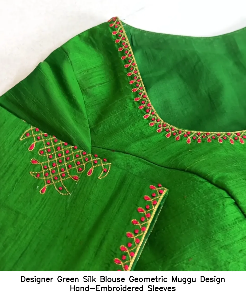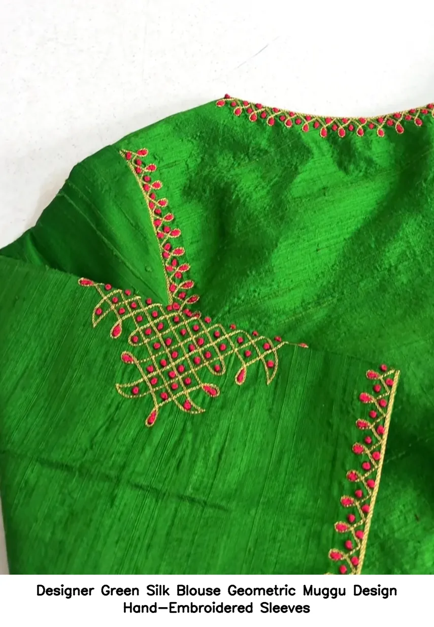 Designer Green Silk Blouse Geometric Muggu Design Hand-Embroidered Sleeves