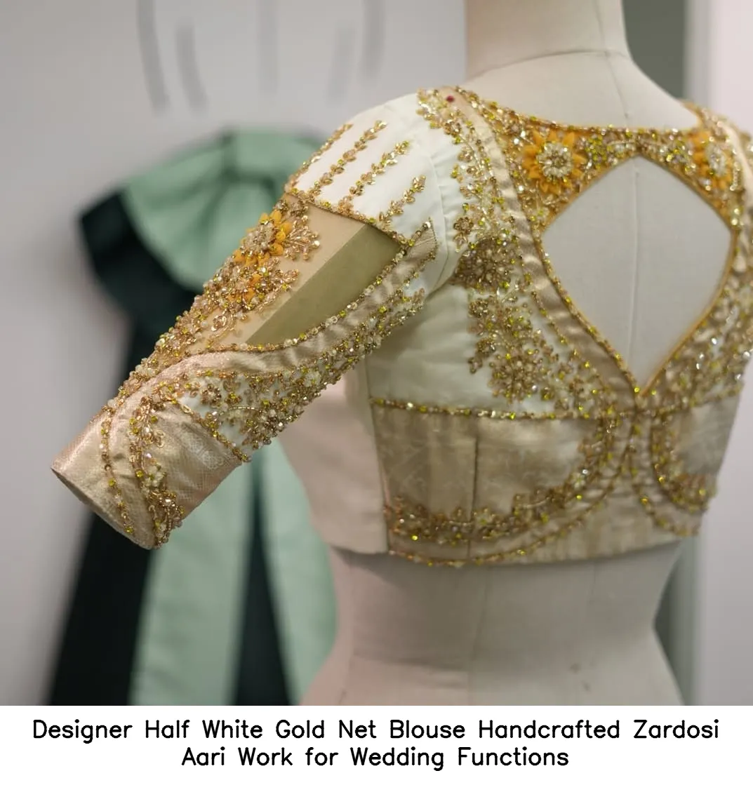 Designer Half White Gold Net Blouse – Handcrafted Zardosi Aari Work for Wedding Functions offers elegance and sophistication. This exquisite piece enhances your wedding attire effortlessly. Moreover, it features intricate handcrafted Zardosi Aari work, adding a touch of luxury to your ensemble.