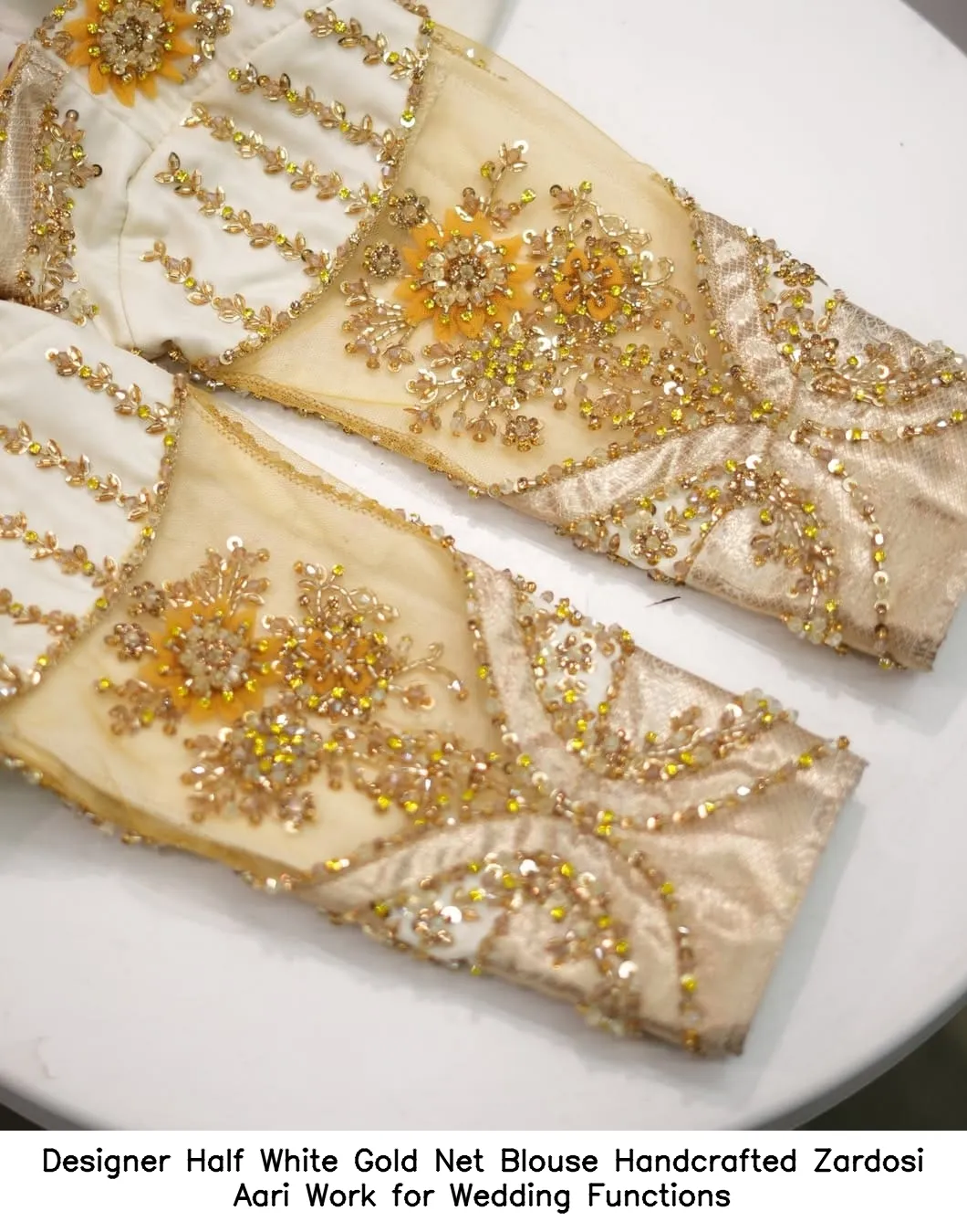 Designer Half White Gold Net Blouse – Handcrafted Zardosi Aari Work for Wedding Functions Features and Benefits