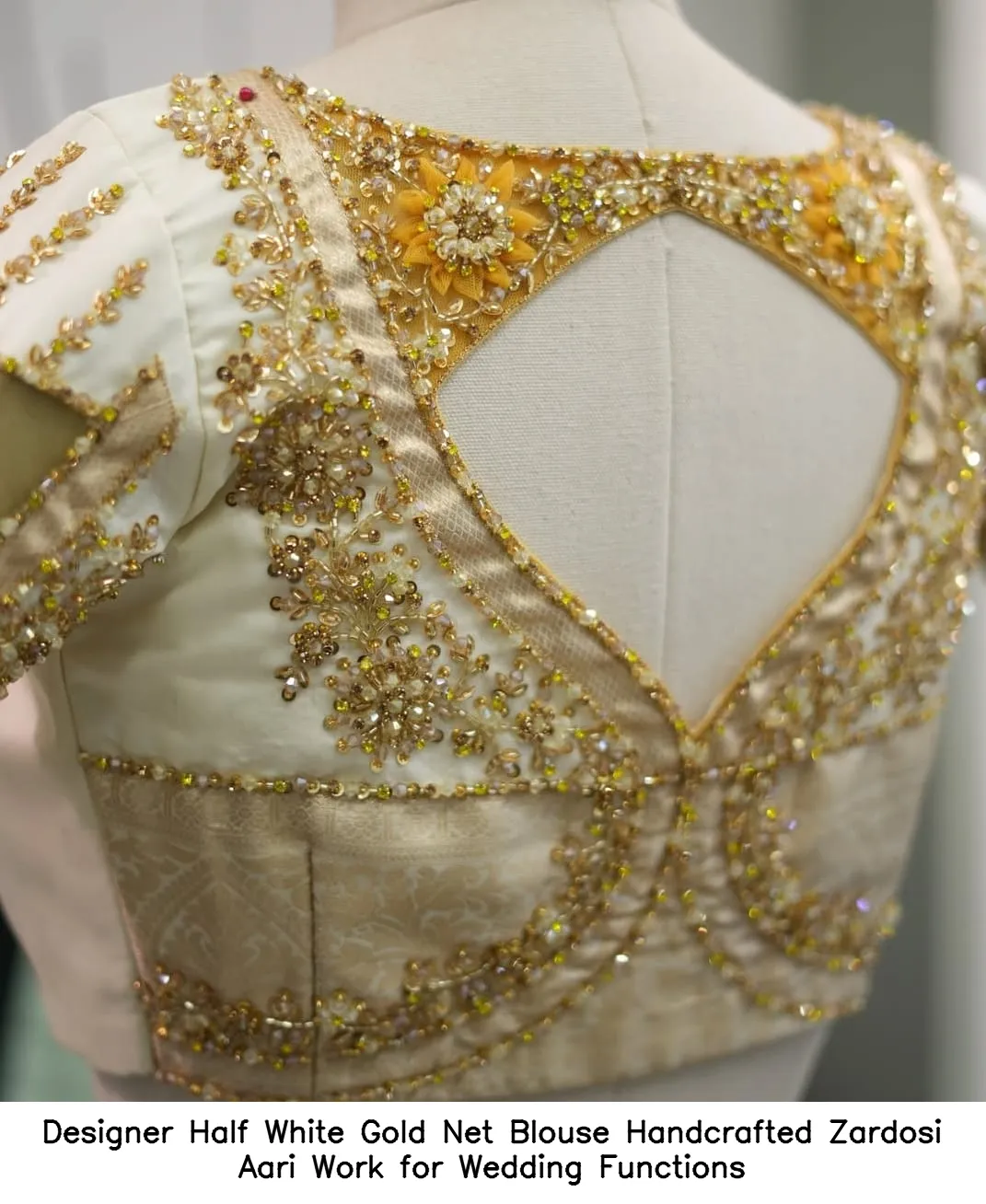 Why Choose Designer Half White Gold Net Blouse – Handcrafted Zardosi Aari Work for Wedding Functions?