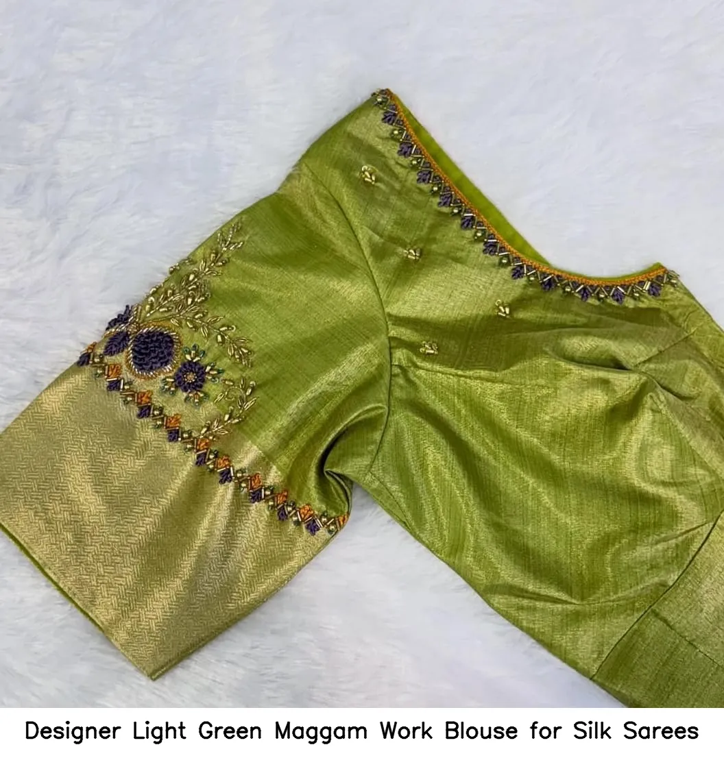 A: This designer light green Maggam work blouse complements various silk sarees, especially those in contrasting colors like deep blues, rich reds, or golds, enhancing the overall elegance of your outfit.
