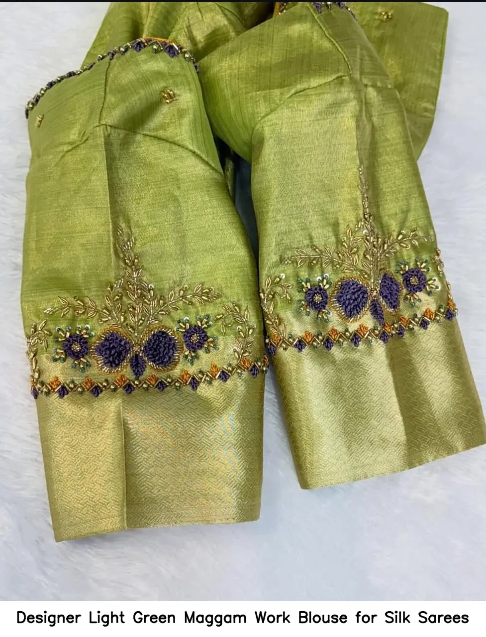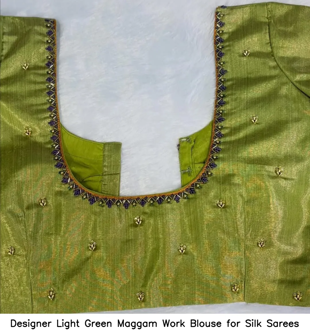 To maintain the beauty of your Designer Light Green Maggam Work Blouse for Silk Sarees, hand wash in cold water and avoid harsh detergents. Iron on a low setting to preserve the intricate designs.