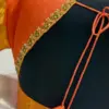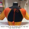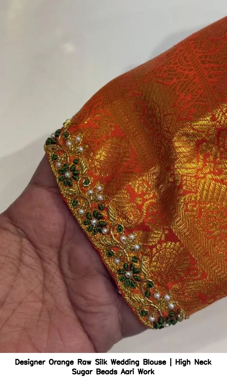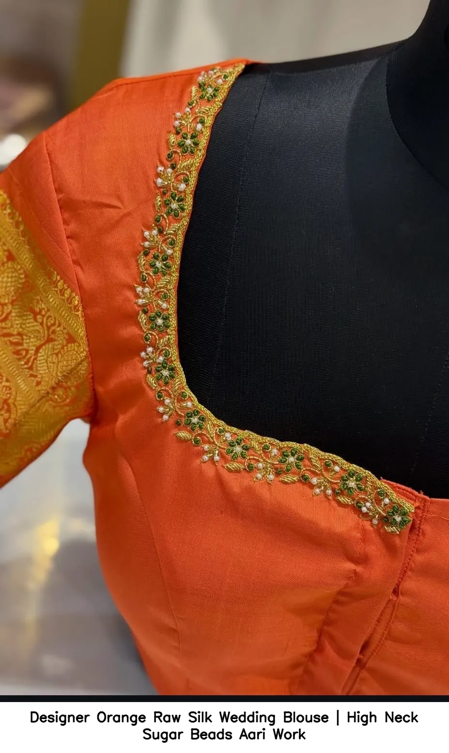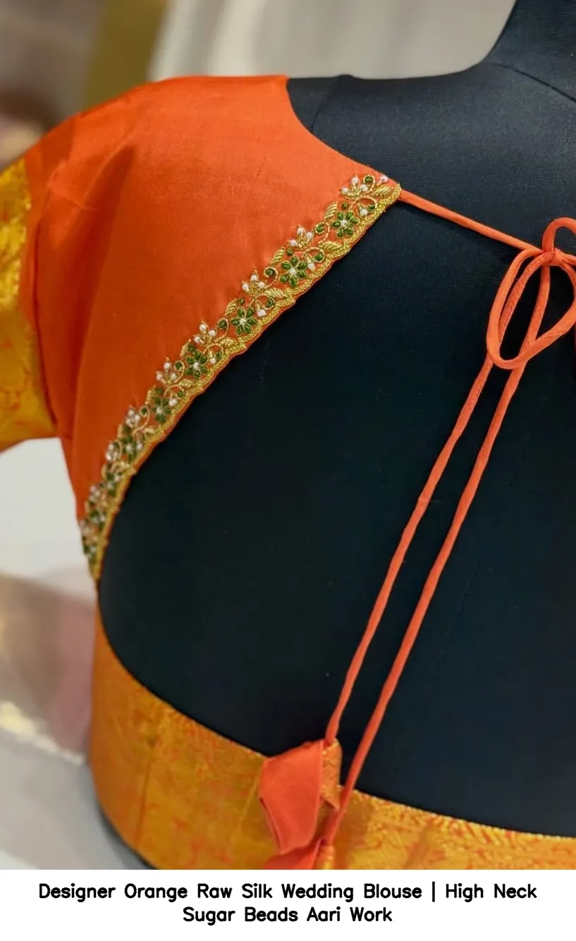 Product Name: Designer Orange Raw Silk Wedding Blouse | High Neck Sugar Beads Aari Work