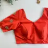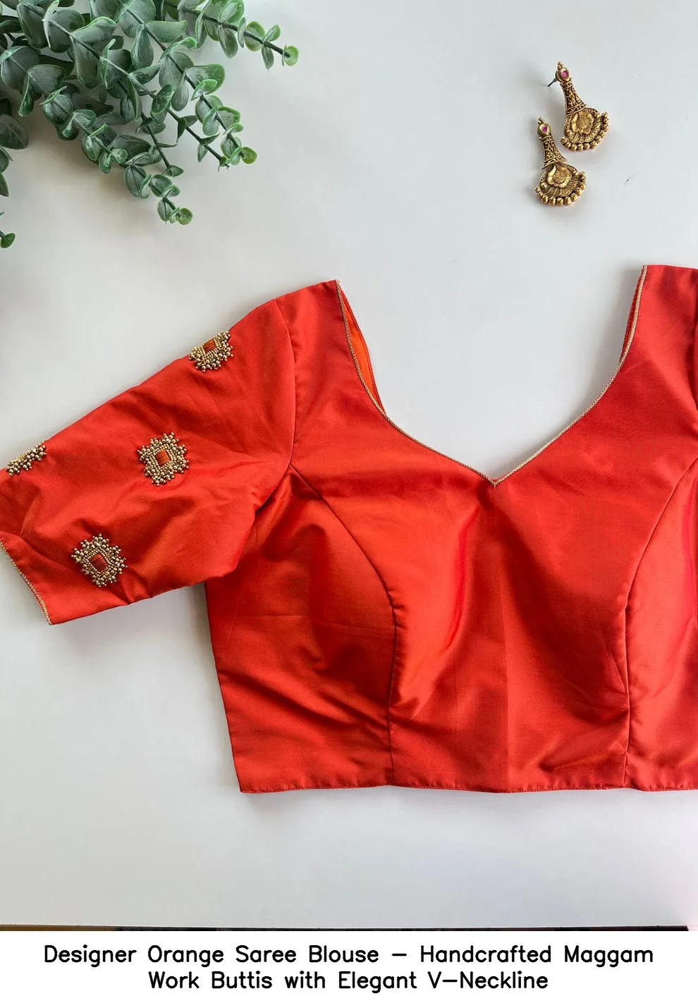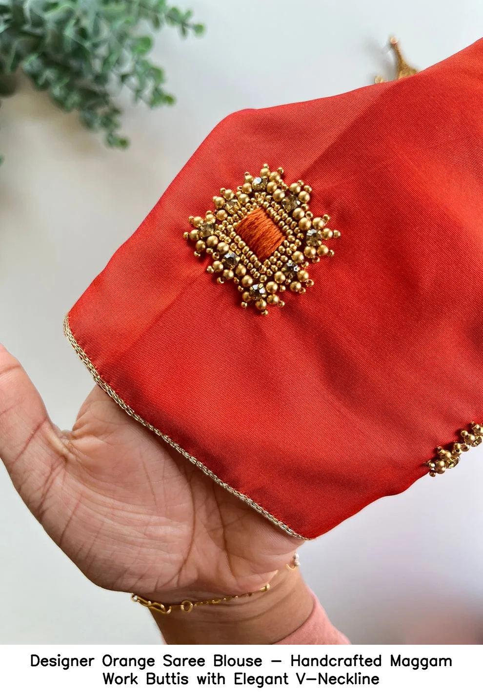 Designer Orange Saree Blouse – Handcrafted Maggam Work Buttis with Elegant V-Neckline