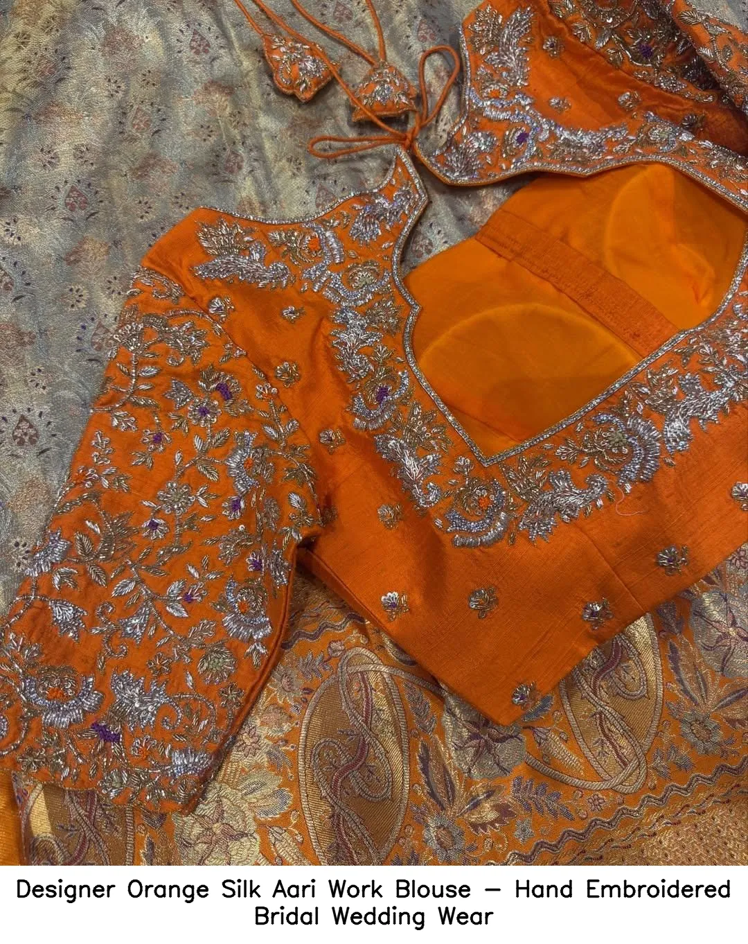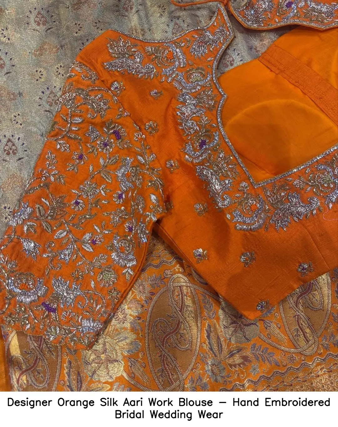 Designer Orange Silk Aari Work Blouse – Hand Embroidered Bridal Wedding Wear