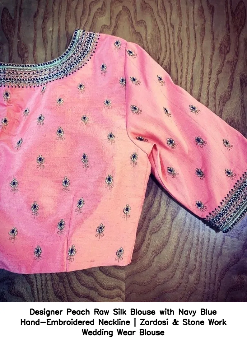 Designer Peach Raw Silk Blouse with Navy Blue Hand-Embroidered Neckline | Zardosi & Stone Work Wedding Wear Blouse