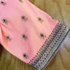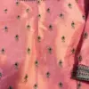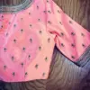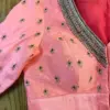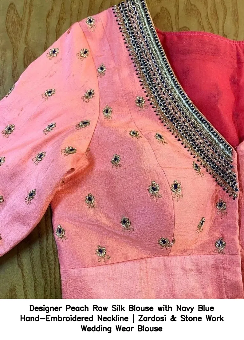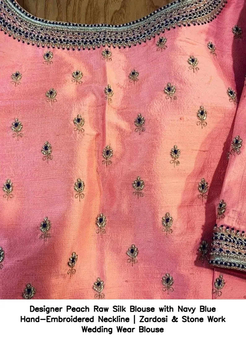 Product Name: Designer Peach Raw Silk Blouse with Navy Blue Hand-Embroidered Neckline | Zardosi & Stone Work Wedding Wear Blouse
