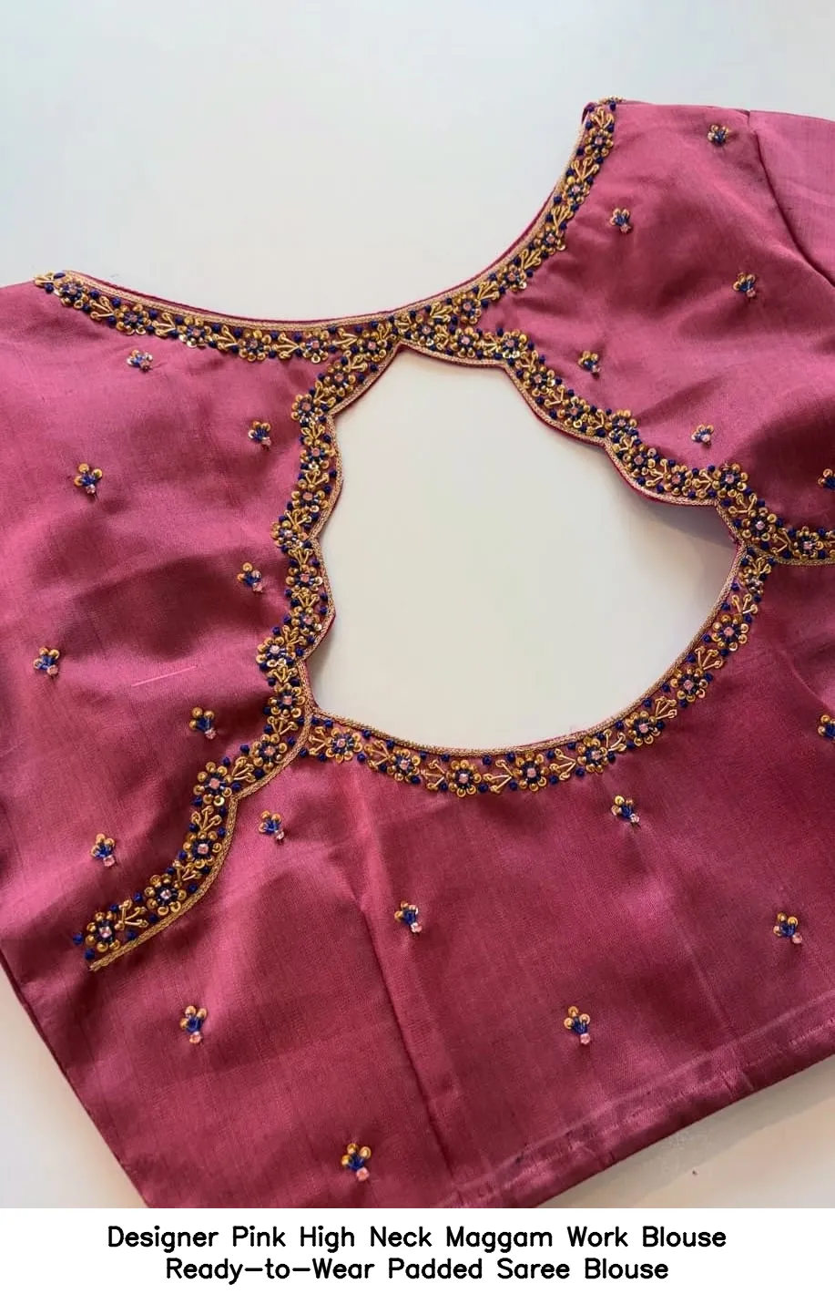 Product Name: Designer Pink High Neck Maggam Work Blouse Ready-to-Wear Padded Saree Blouse
