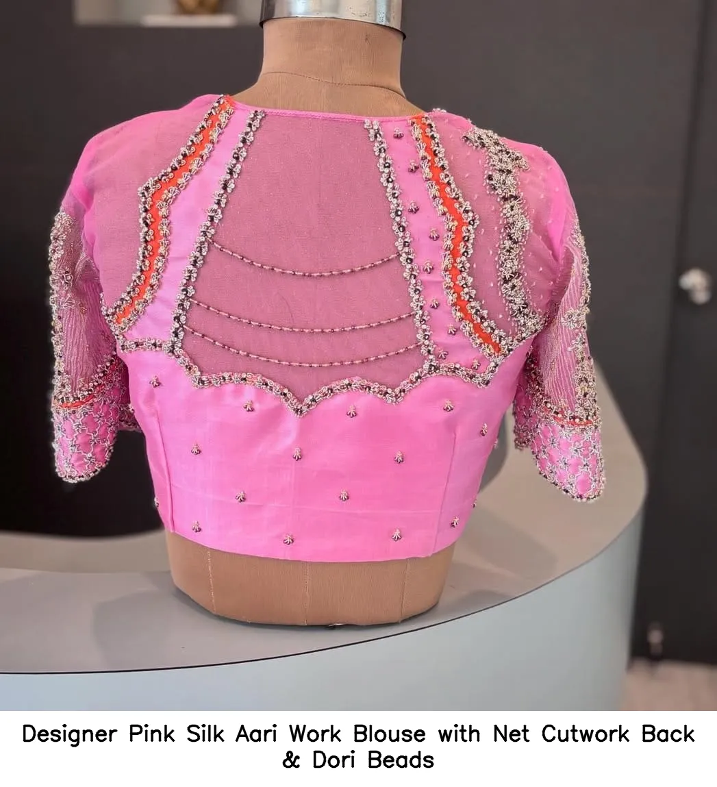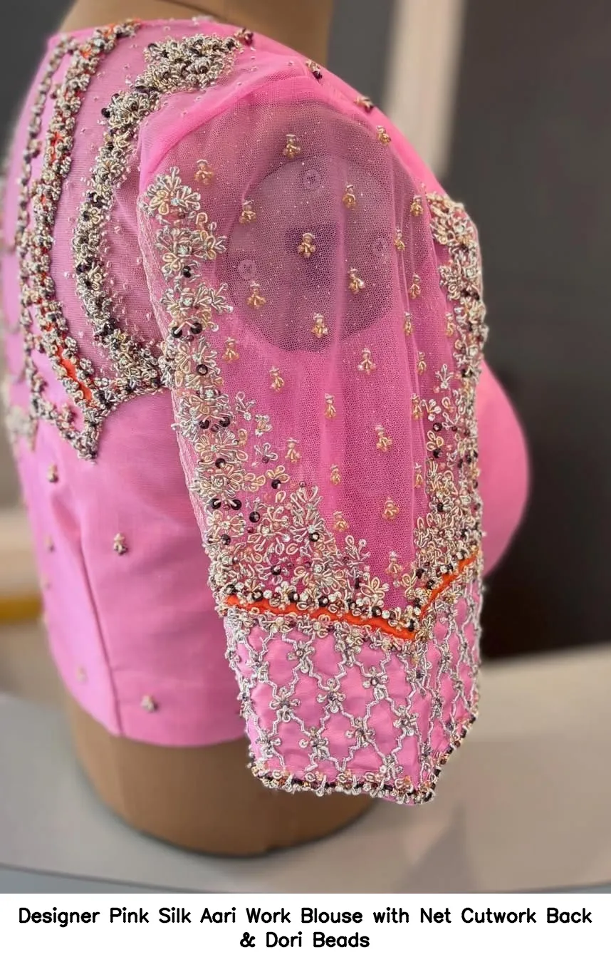 Designer Pink Silk Aari Work Blouse with Net Cutwork Back & Dori Beads