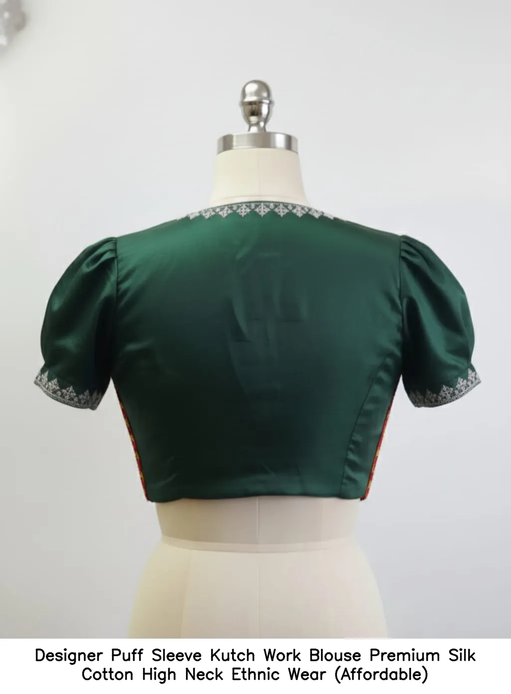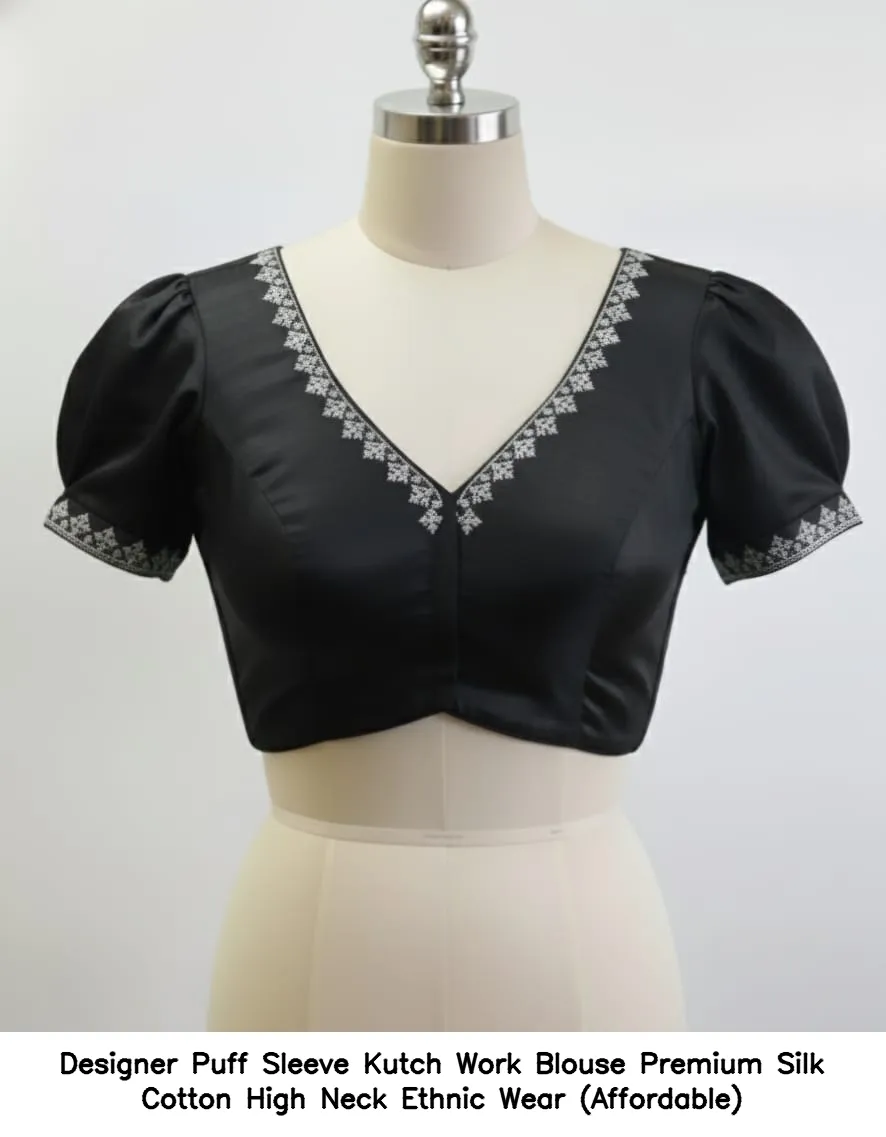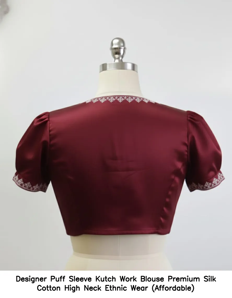 Product Name: ​Designer Puff Sleeve Kutch Work Blouse – Premium Silk Cotton High Neck Ethnic Wear (Affordable)