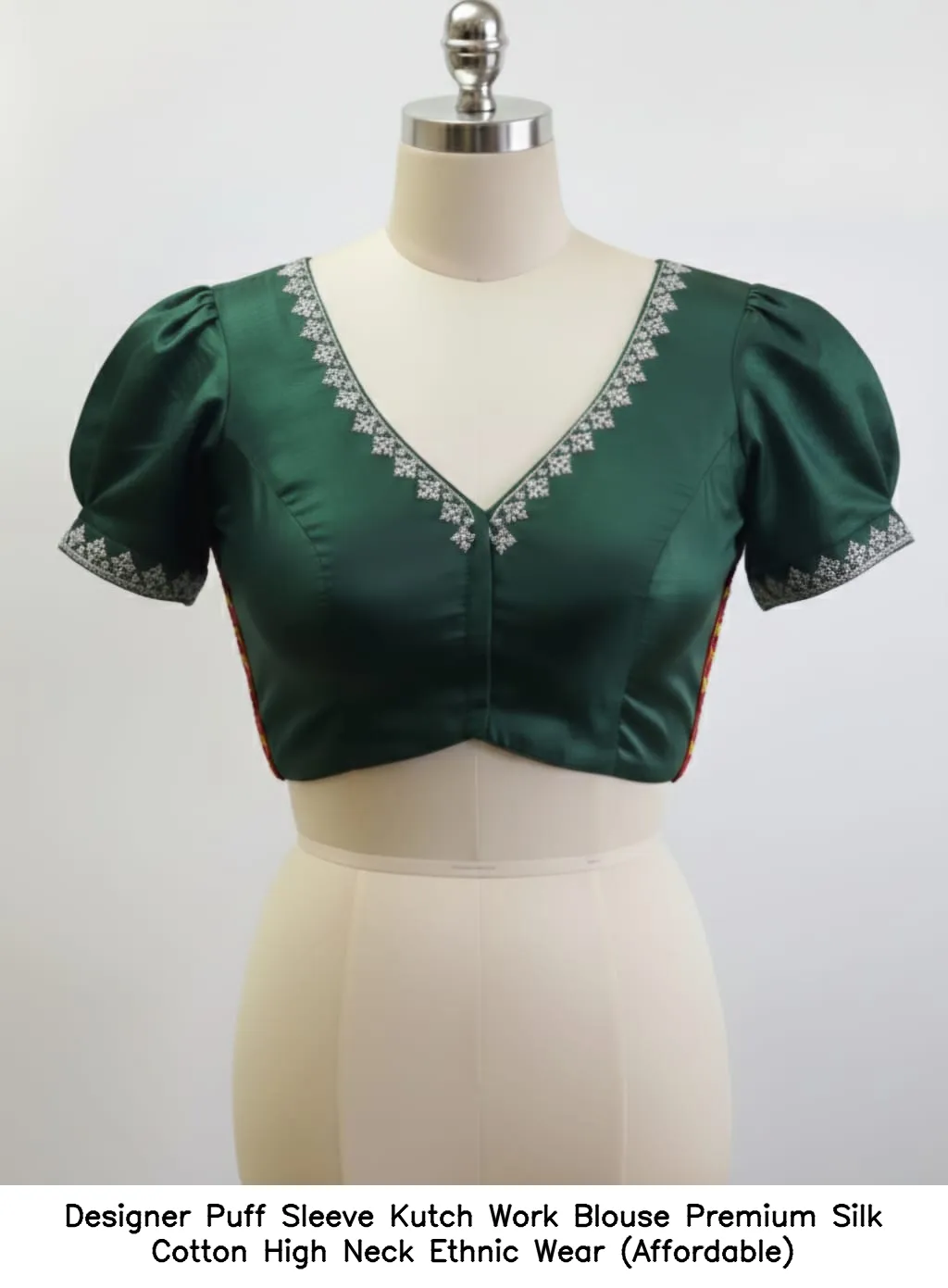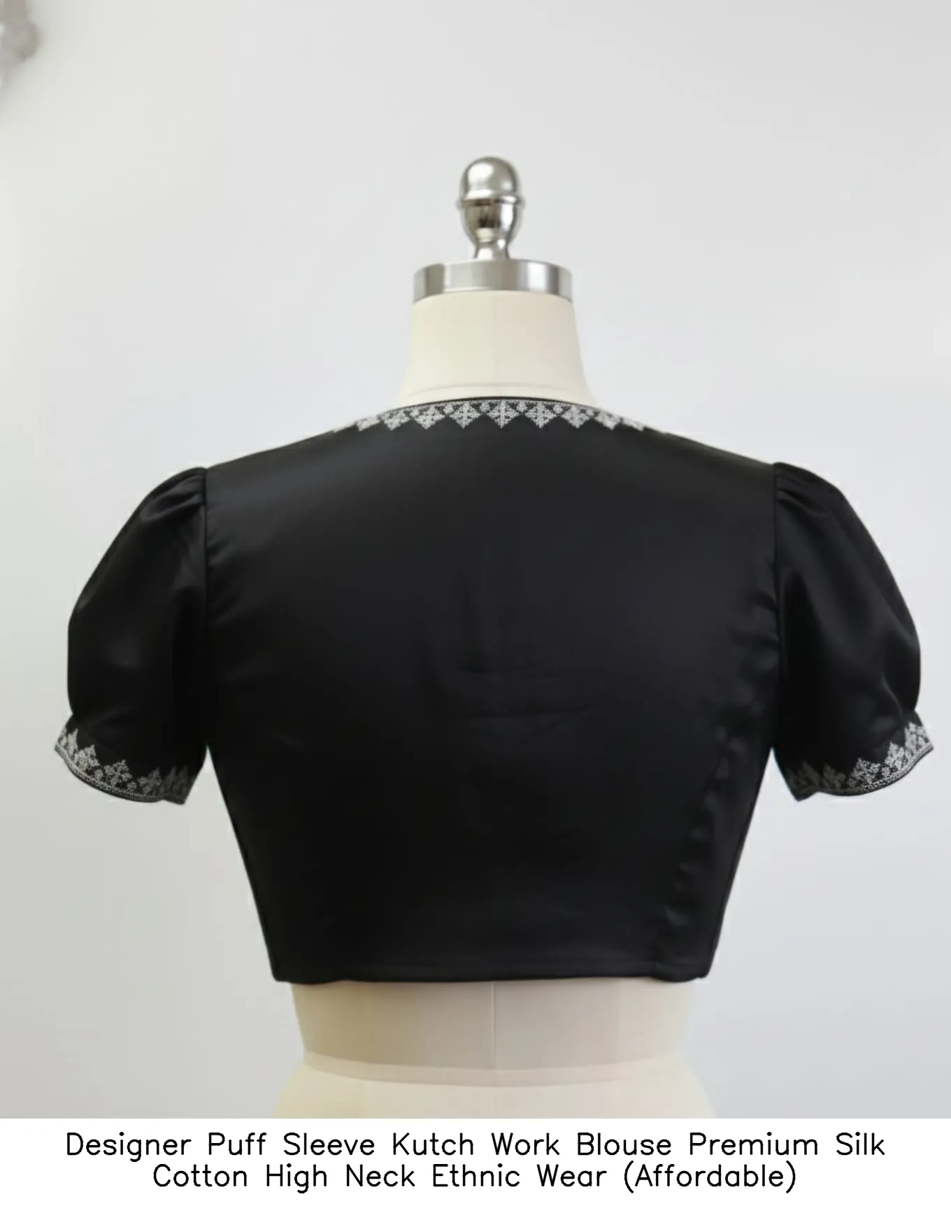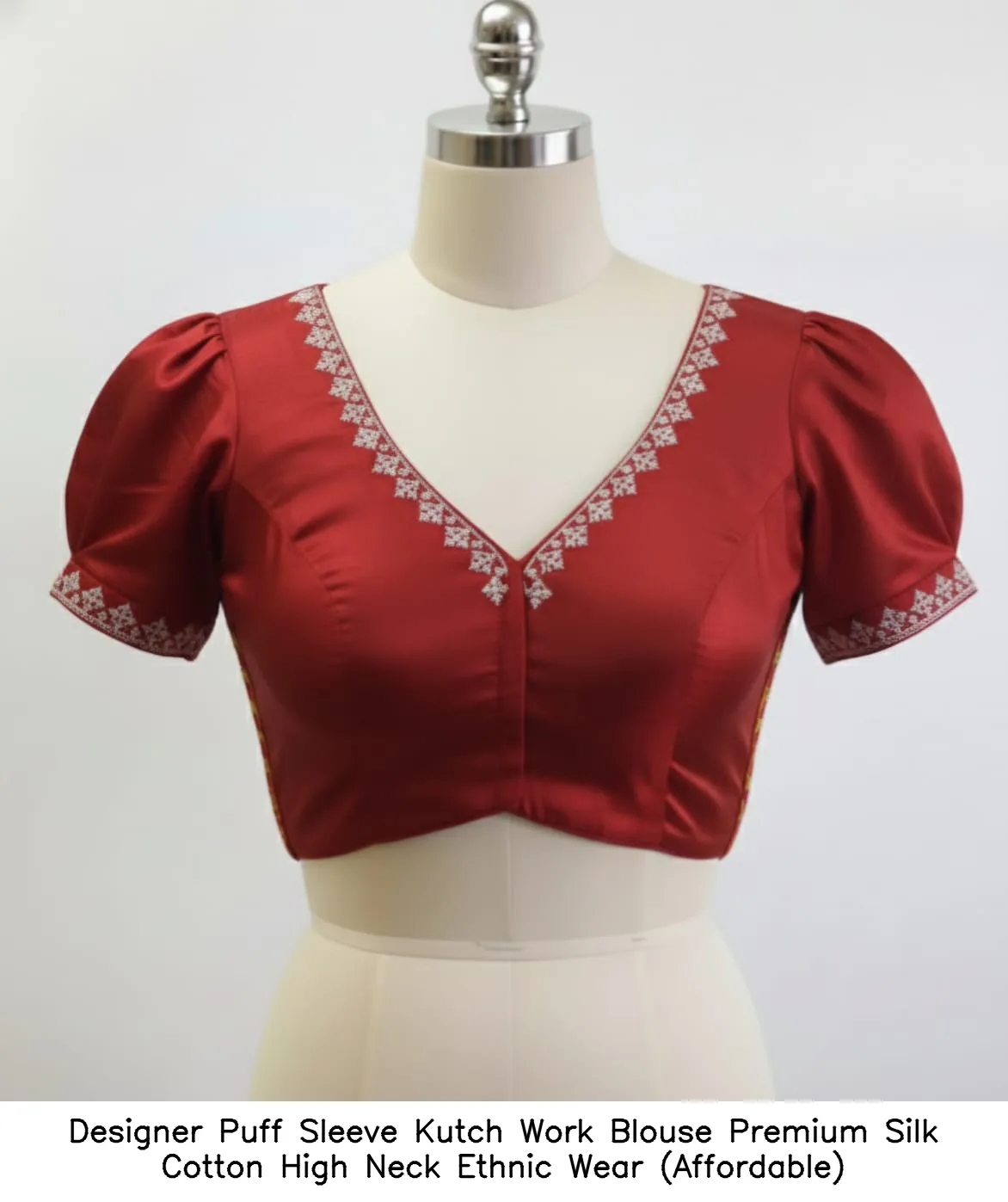 Product Name: ​Designer Puff Sleeve Kutch Work Blouse – Premium Silk Cotton High Neck Ethnic Wear (Affordable)