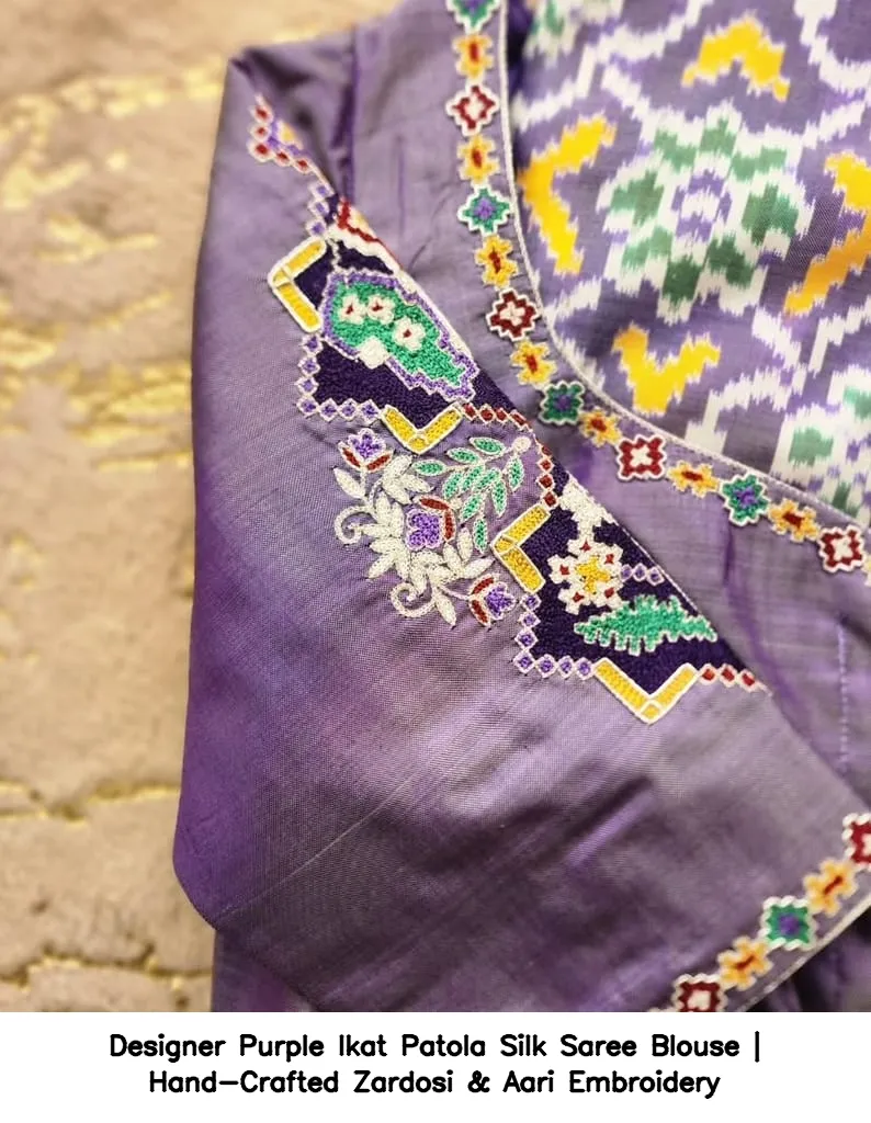 Designer Purple Ikat Patola Silk Saree Blouse | Hand-Crafted Zardosi & Aari Embroidery