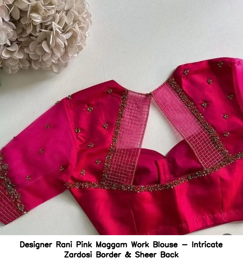 Designer Rani Pink Maggam Work Blouse – Intricate Zardosi Border & Sheer Back