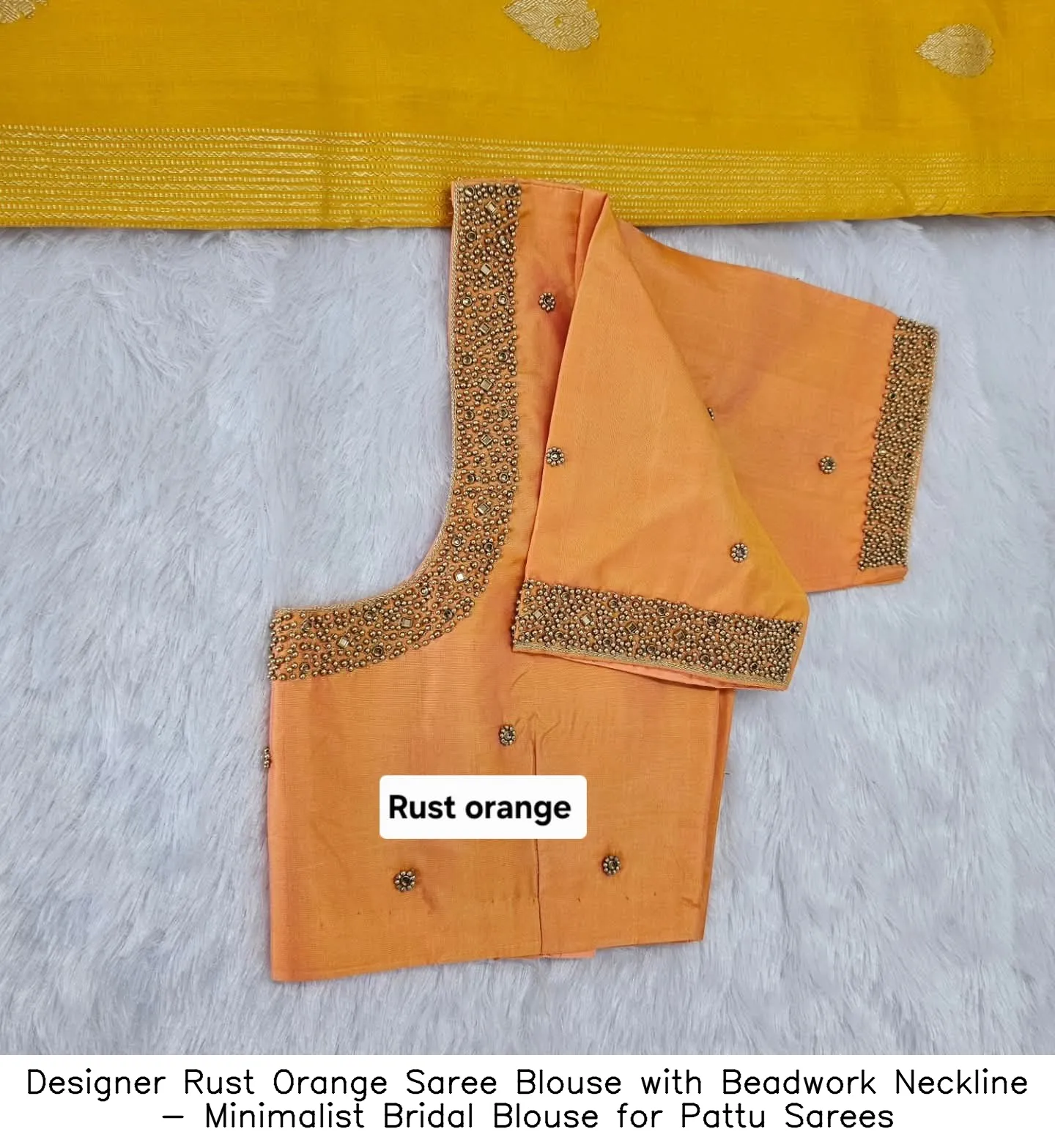- Product Name: Designer Rust Orange Saree Blouse with Beadwork Neckline – Minimalist Bridal Blouse for Pattu Sarees