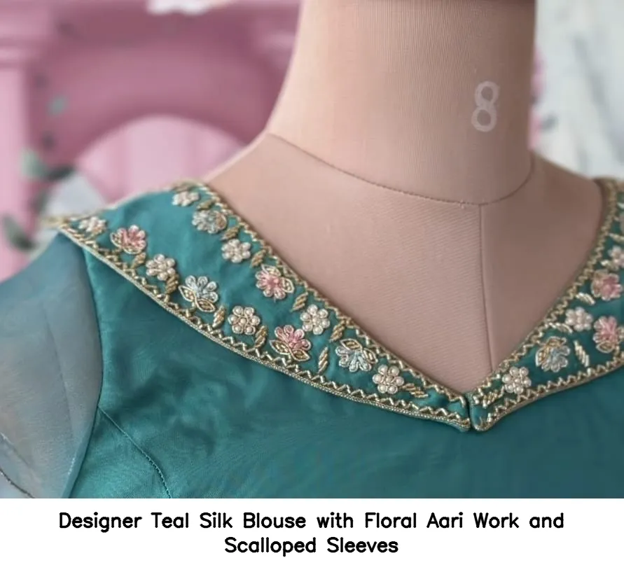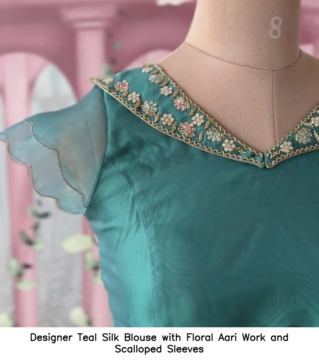 Designer Teal Silk Blouse with Floral Aari Work and Scalloped Sleeves