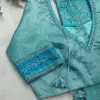 To maintain the beauty of your Designer Turquoise Silk Blouse – Aari Work V-Neckline & Matching Lotus Latkans, hand wash in cold water. Avoid bleach and do not wring. Iron on a low setting to keep the fabric looking pristine.