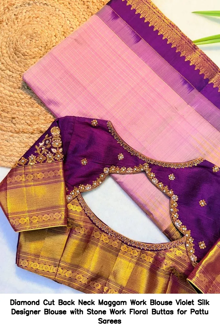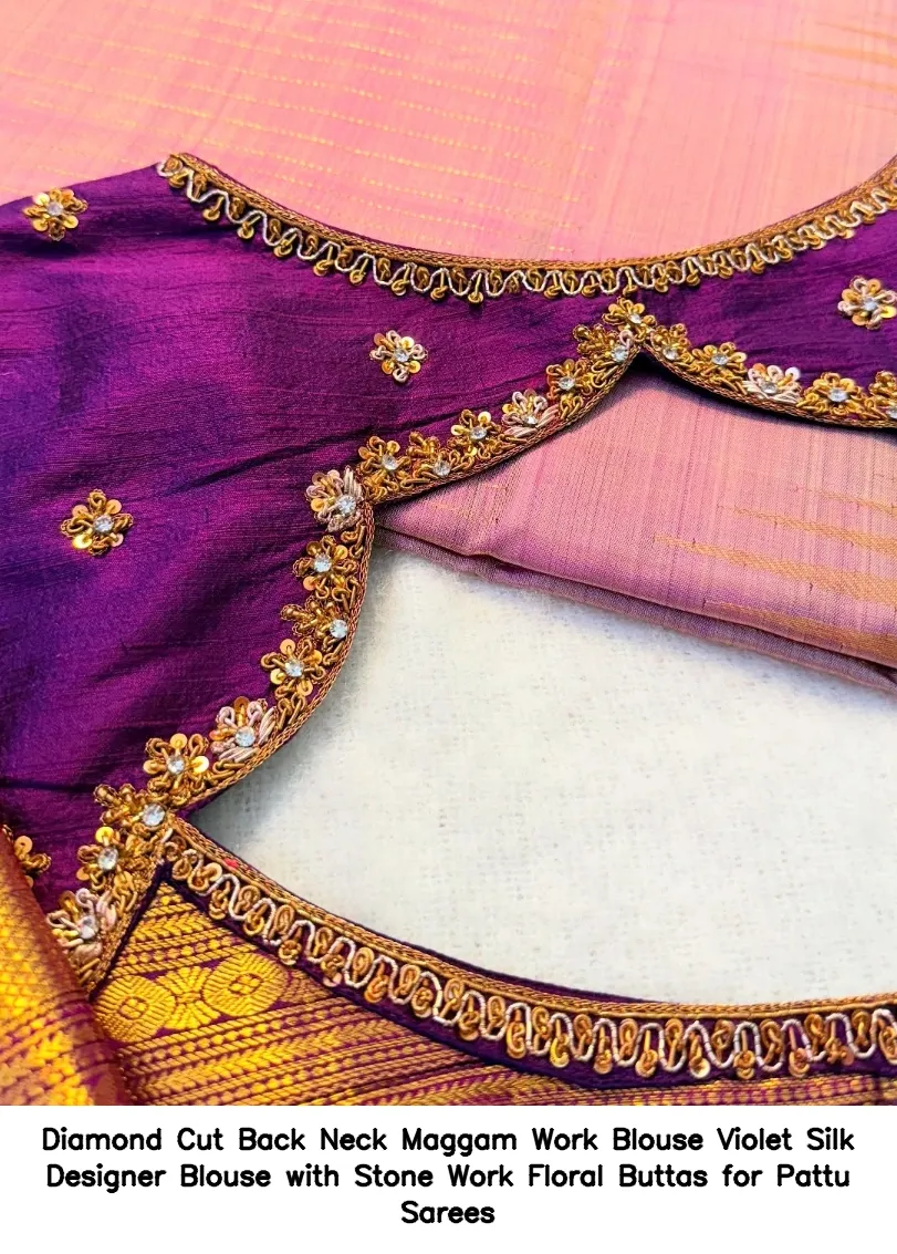 Introducing the stunning Diamond Cut Back Neck Maggam Work Blouse – Violet Silk Designer Blouse with Stone Work Floral Buttas for Pattu Sarees. This exquisite blouse features intricate maggam work and a beautiful back neck design, making it the perfect addition to your ethnic wardrobe.