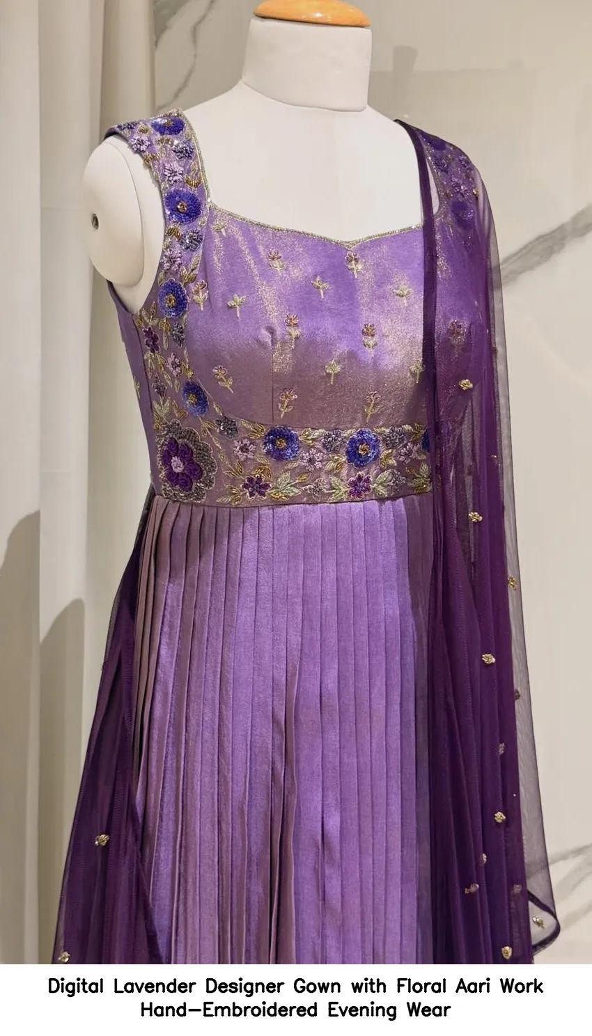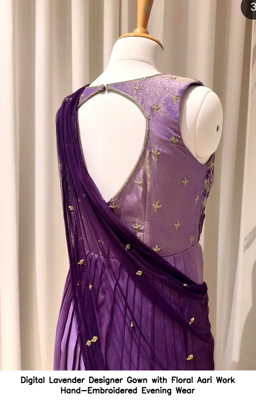 Product Name: ​​​​Digital Lavender Designer Gown with Floral Aari Work Hand-Embroidered Evening Wear