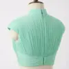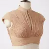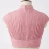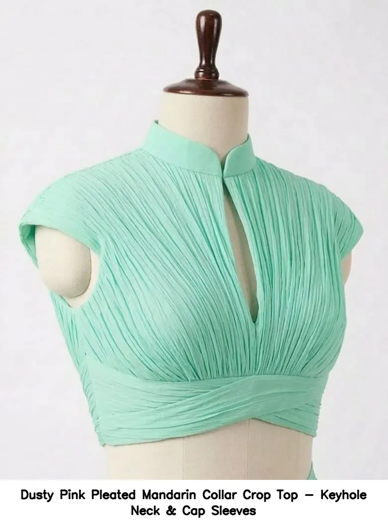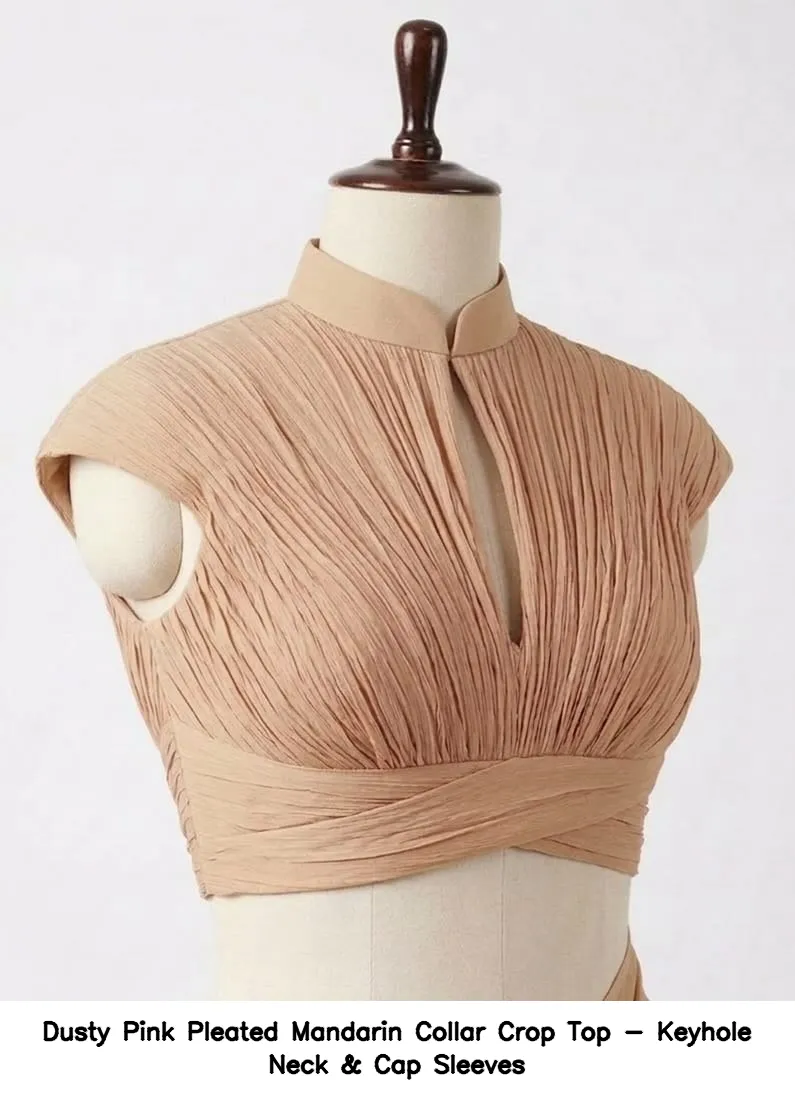 Product Name: Dusty Pink Pleated Mandarin Collar Crop Top – Keyhole Neck & Cap Sleeves