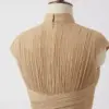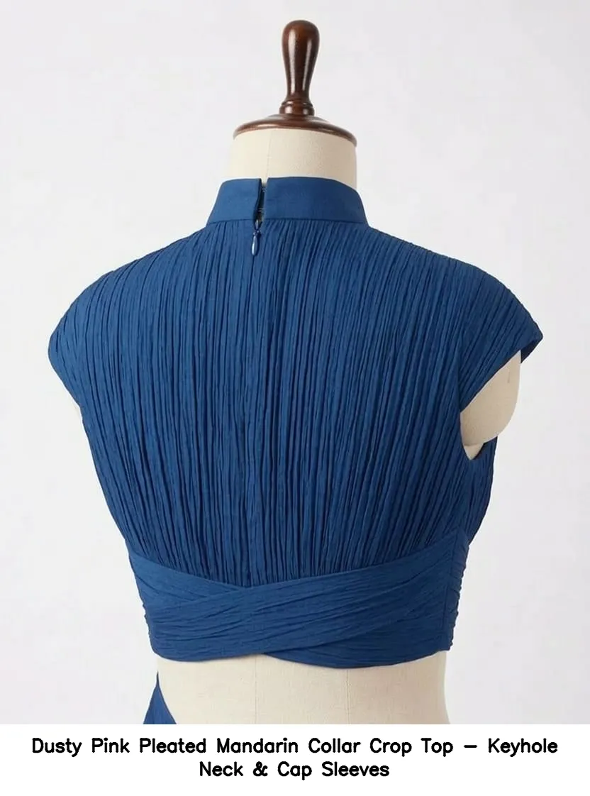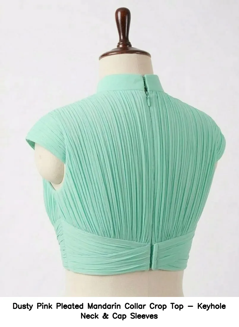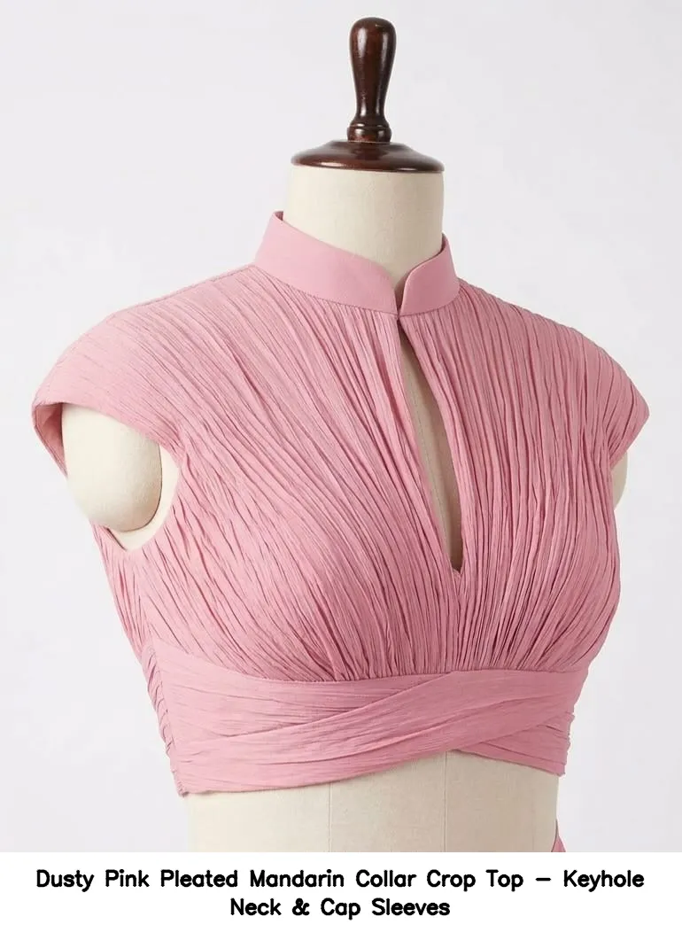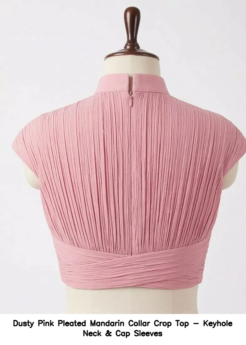 Dusty Pink Pleated Mandarin Collar Crop Top – Keyhole Neck & Cap Sleeves