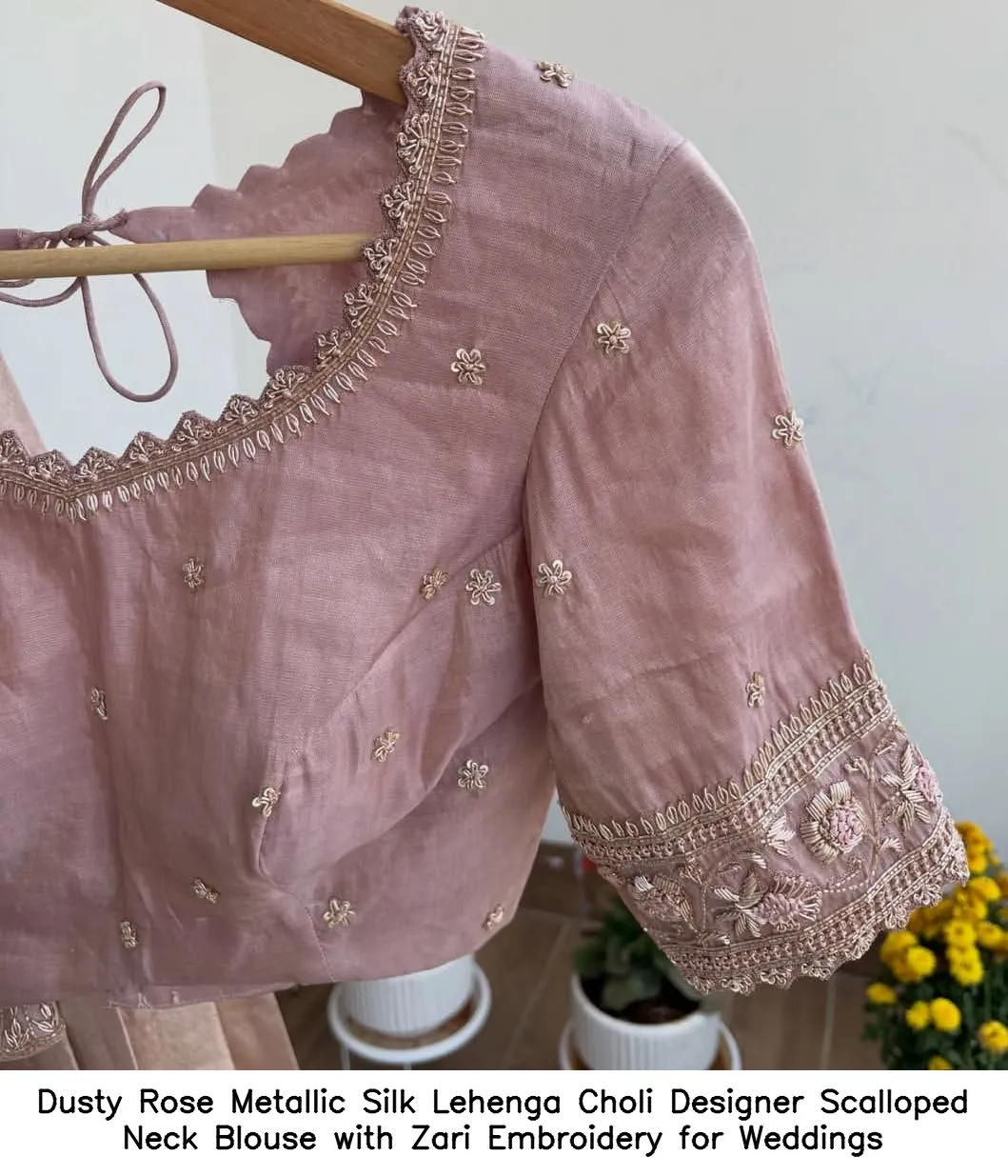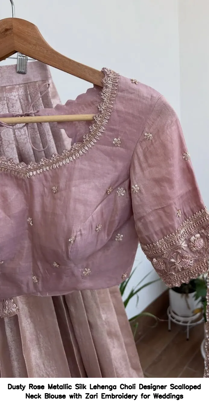 Dusty Rose Metallic Silk Lehenga Choli – Designer Scalloped Neck Blouse with Zari Embroidery for Weddings