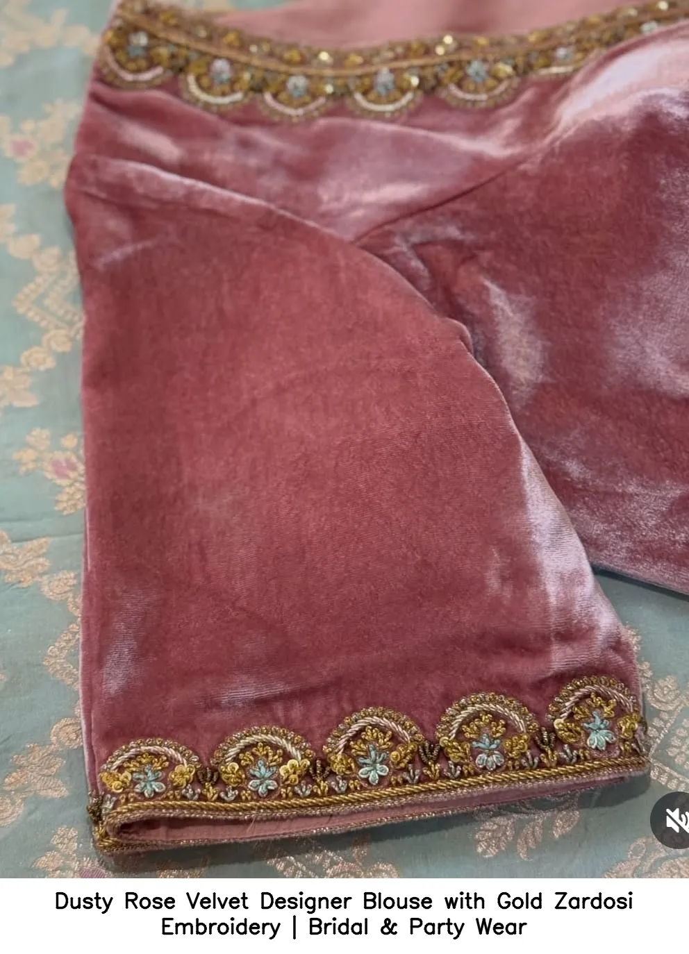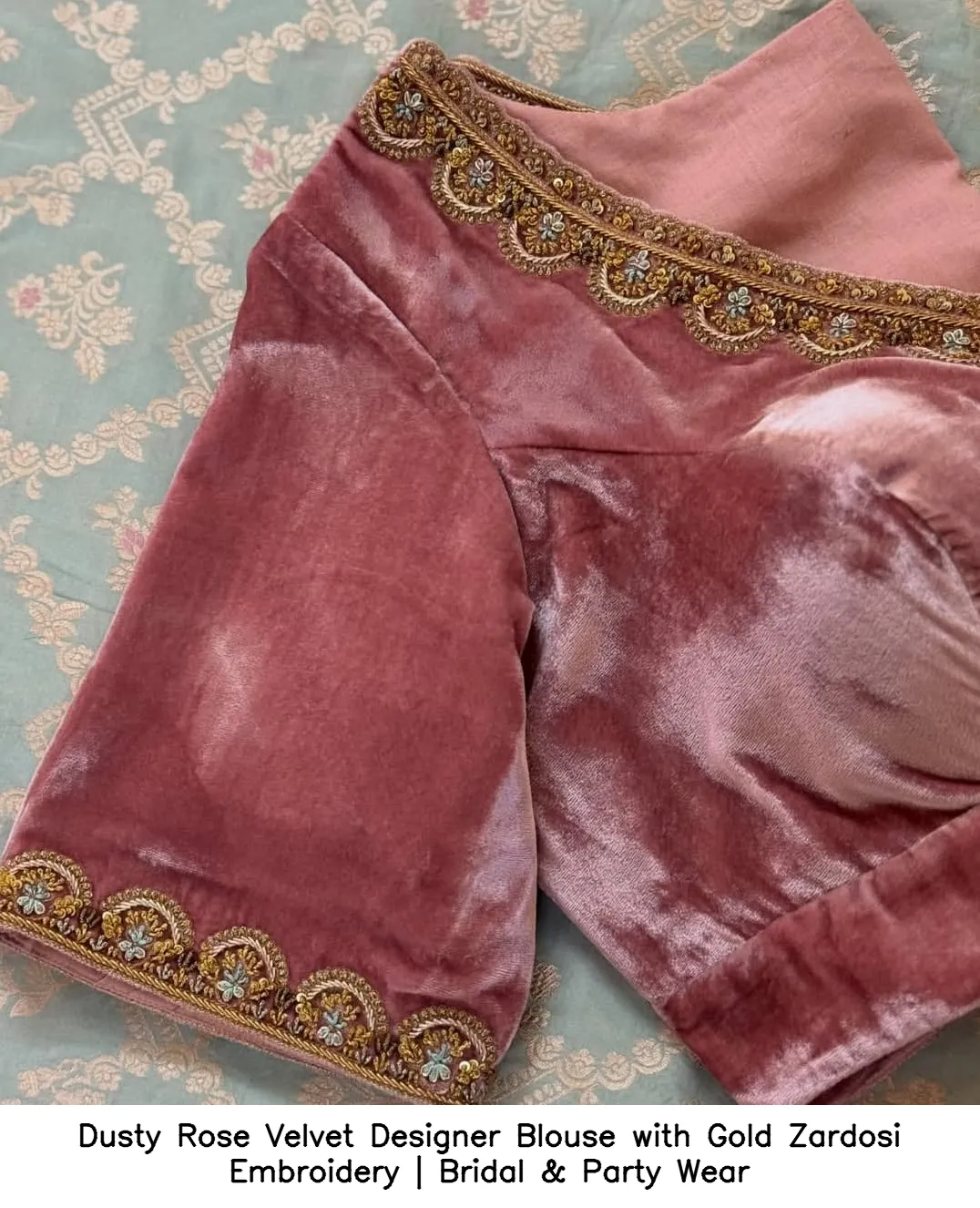 Dusty Rose Velvet Designer Blouse with Gold Zardosi Embroidery | Bridal & Party Wear