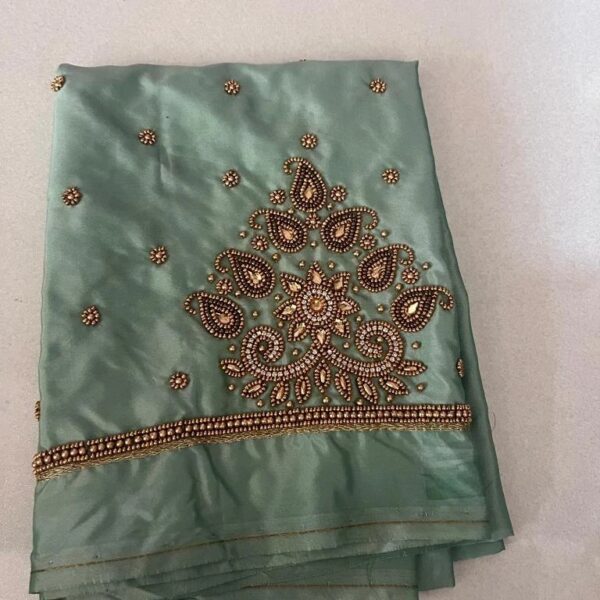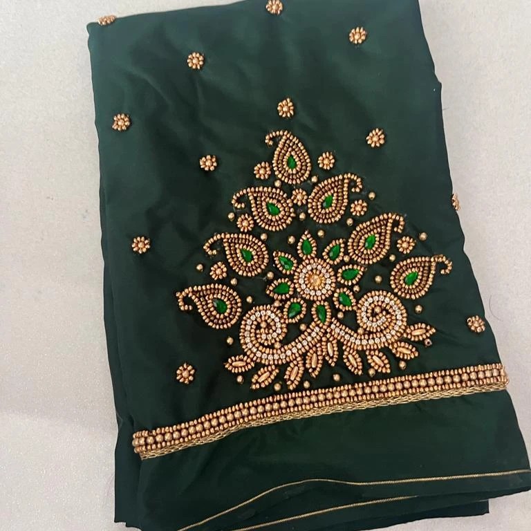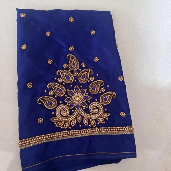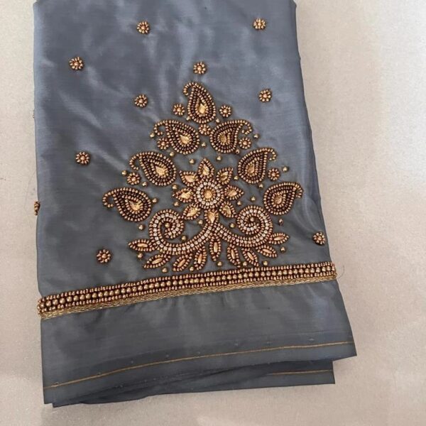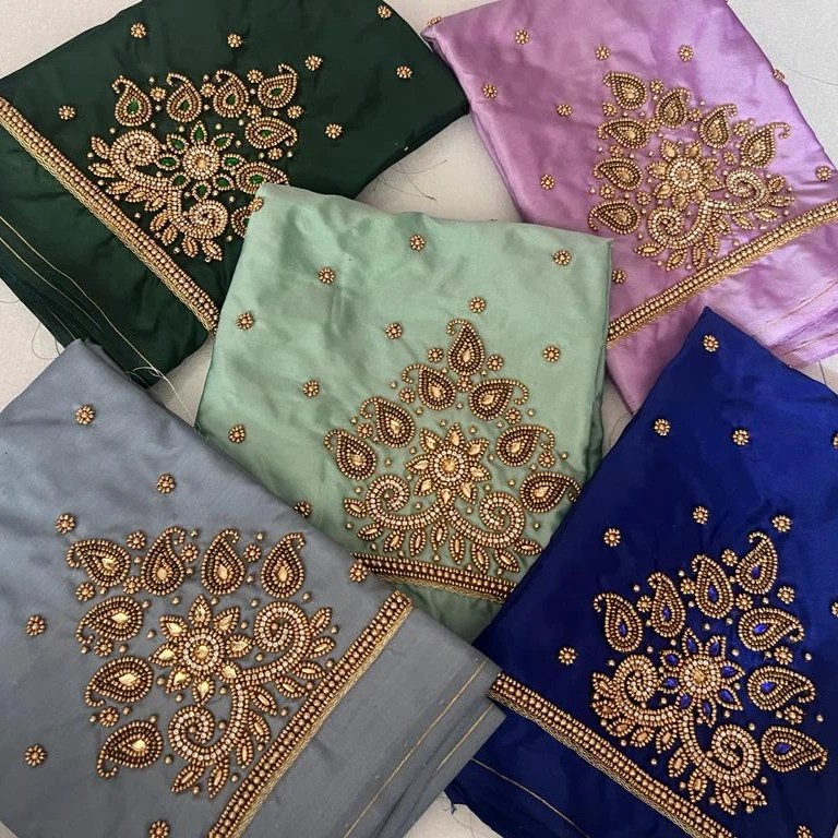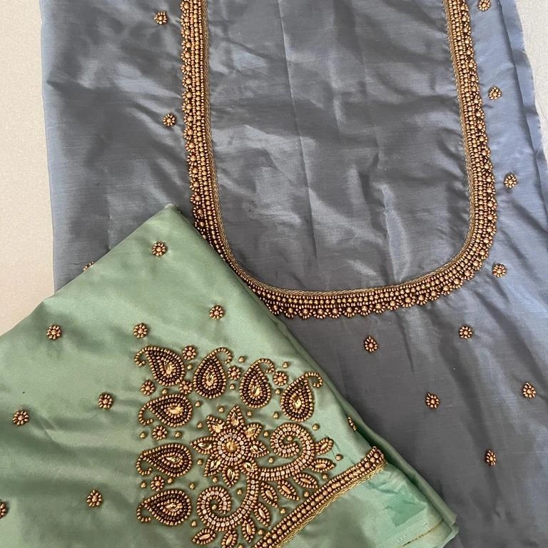 Stunning Raw Silk with Aari Work blouse. Crafted for wedding and festive wear, pairs beautifully with silk sarees and lehengas.