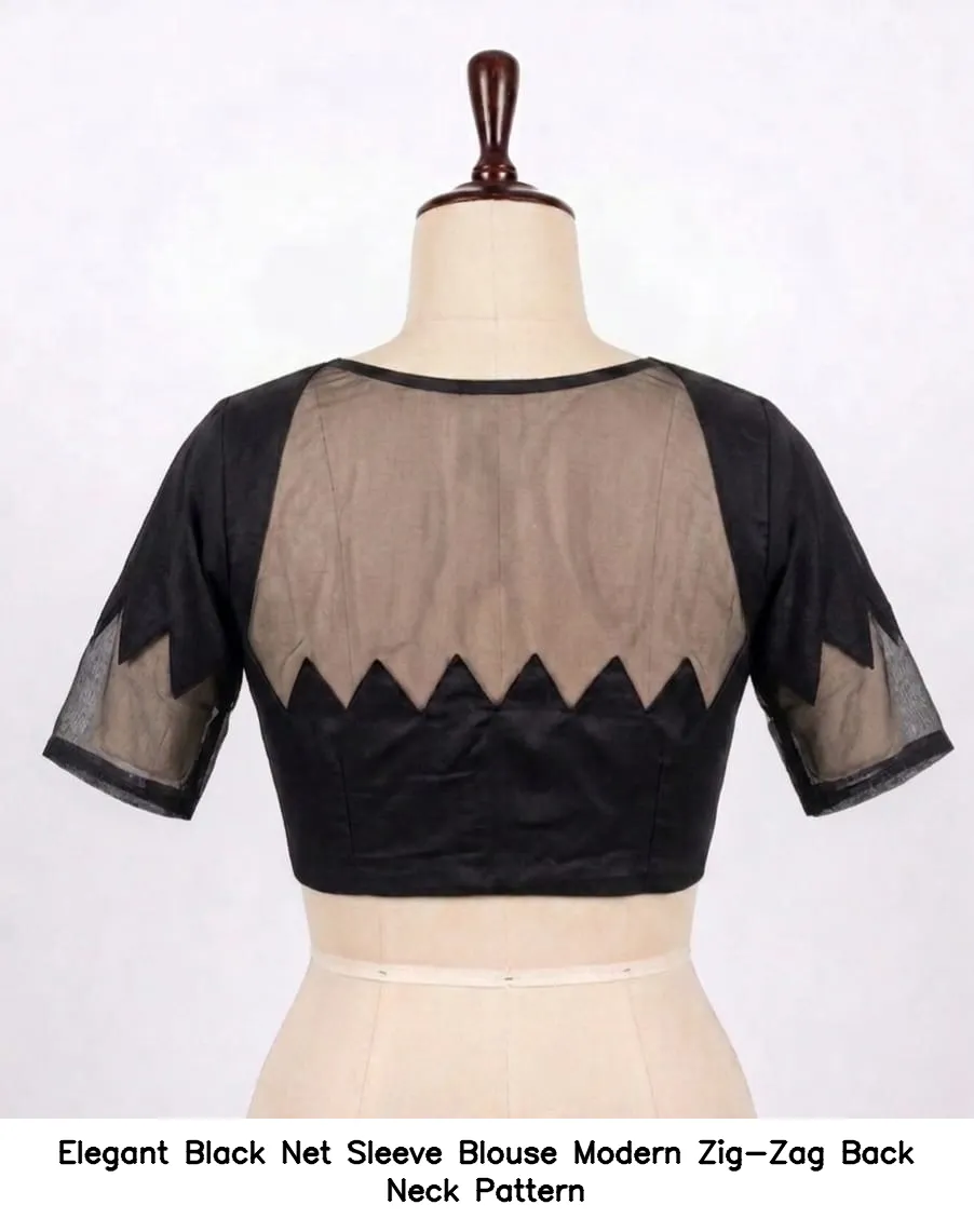 Product Name: Elegant Black Net Sleeve Blouse – Modern Zig-Zag Back Neck Pattern