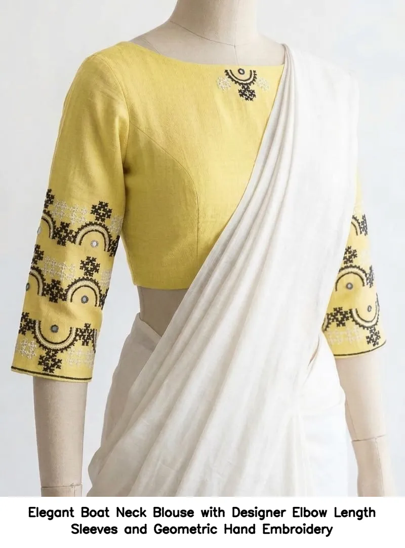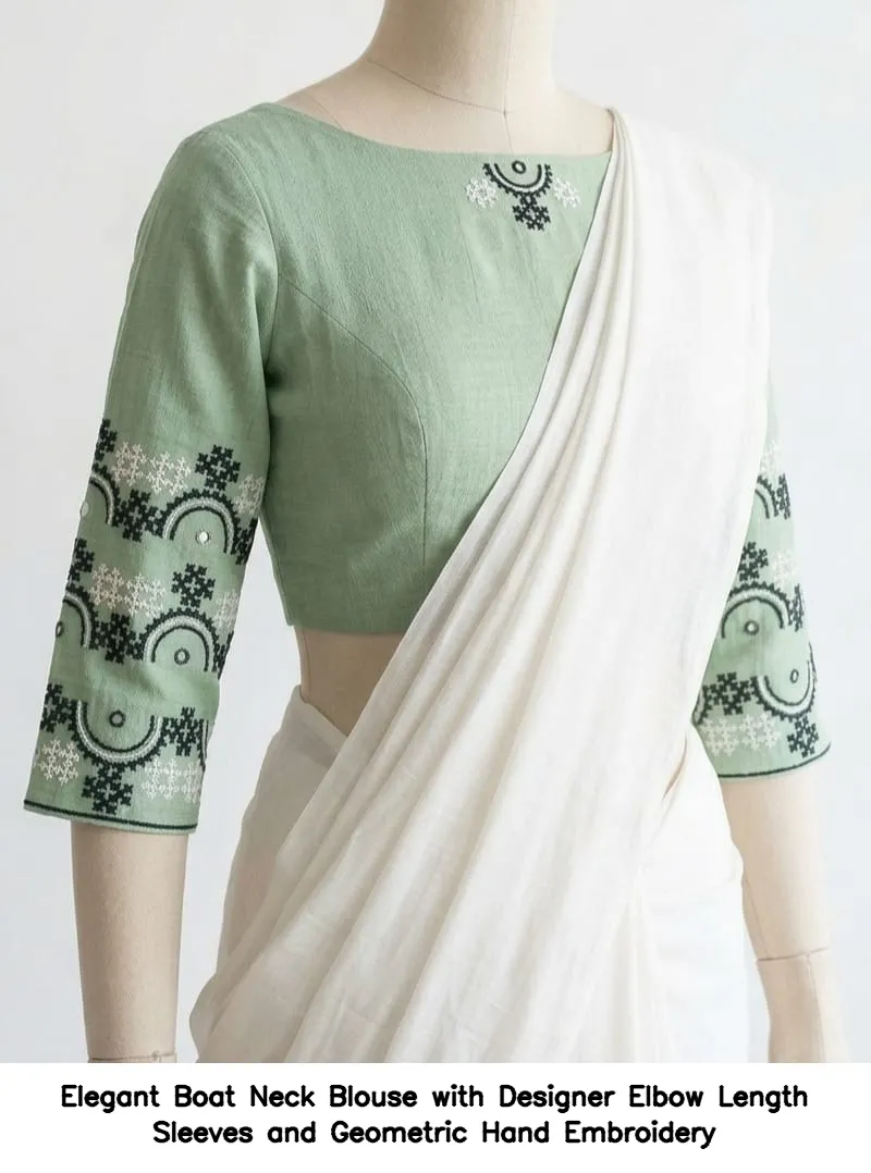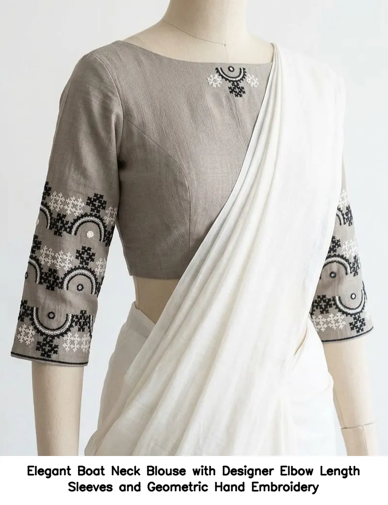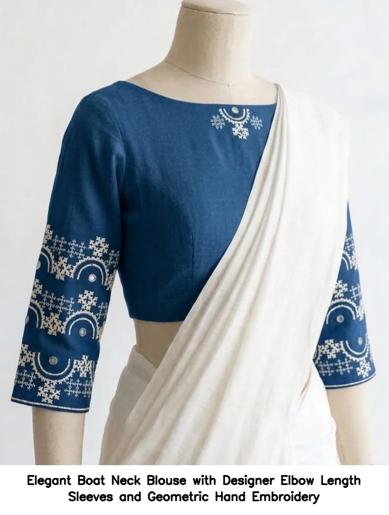Elegant Boat Neck Blouse with Designer Elbow Length Sleeves and Geometric Hand Embroidery