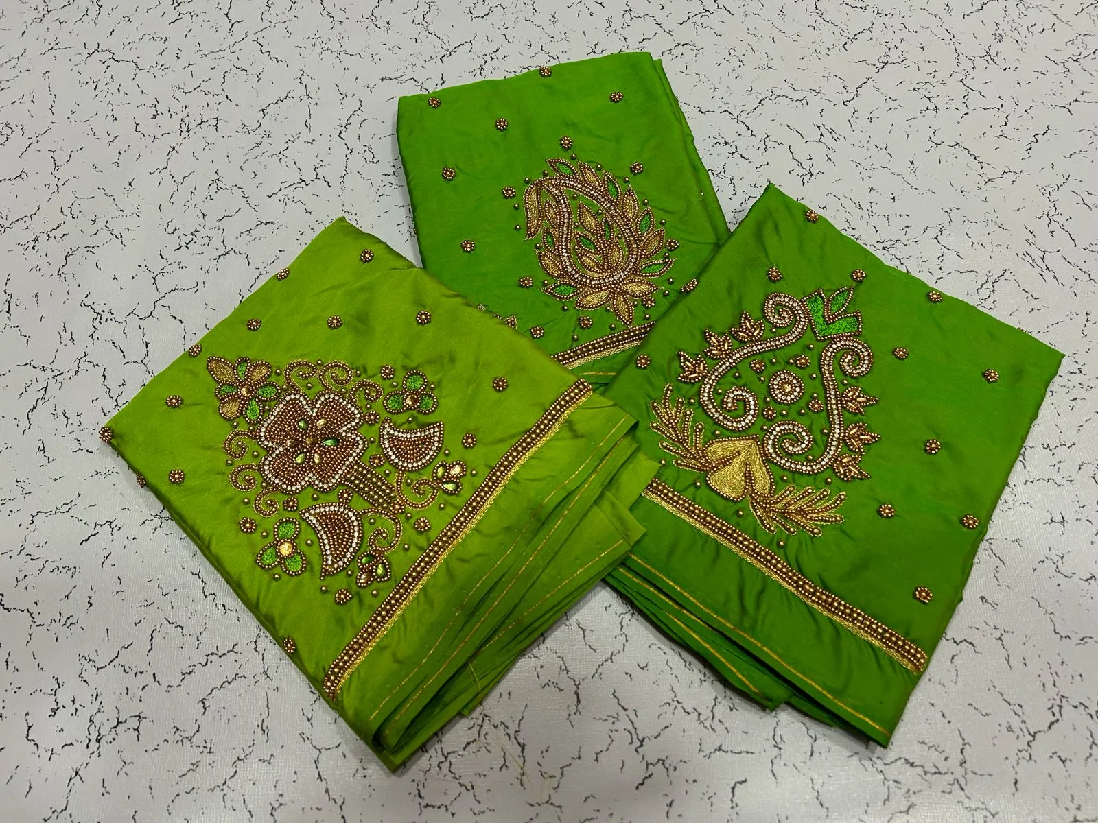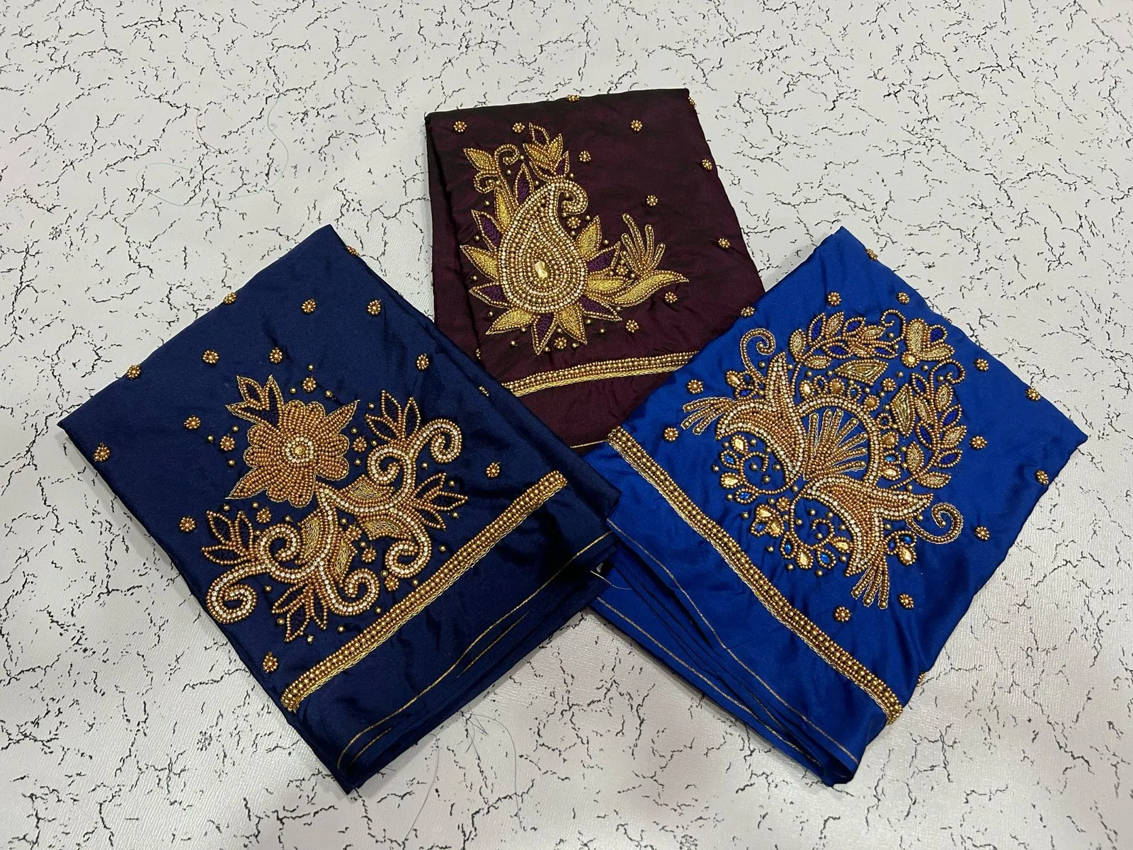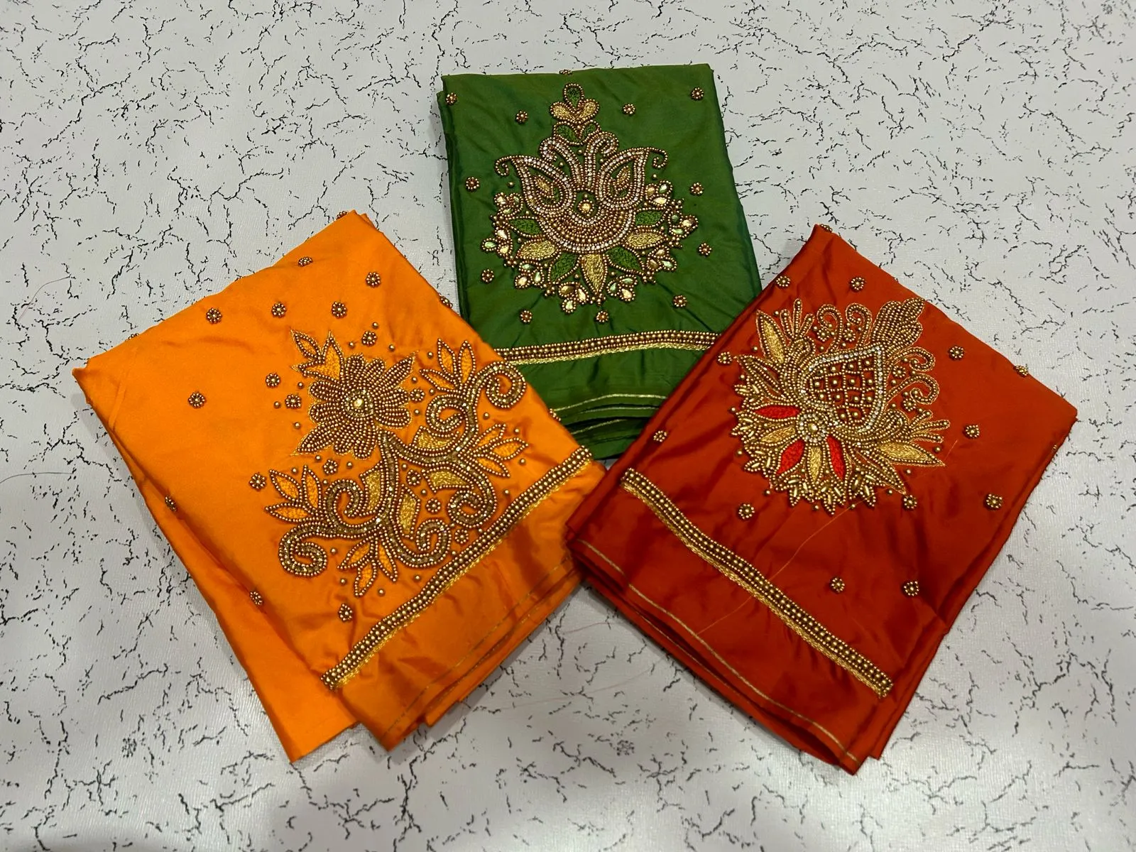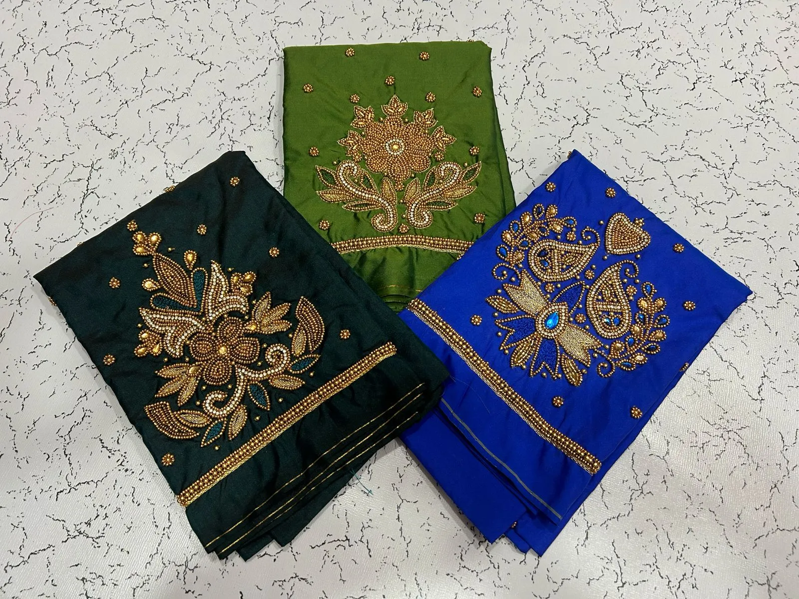Stunning Raw Silk with Maggam Work blouse. Crafted for wedding and festive wear, pairs beautifully with silk sarees and lehengas.
