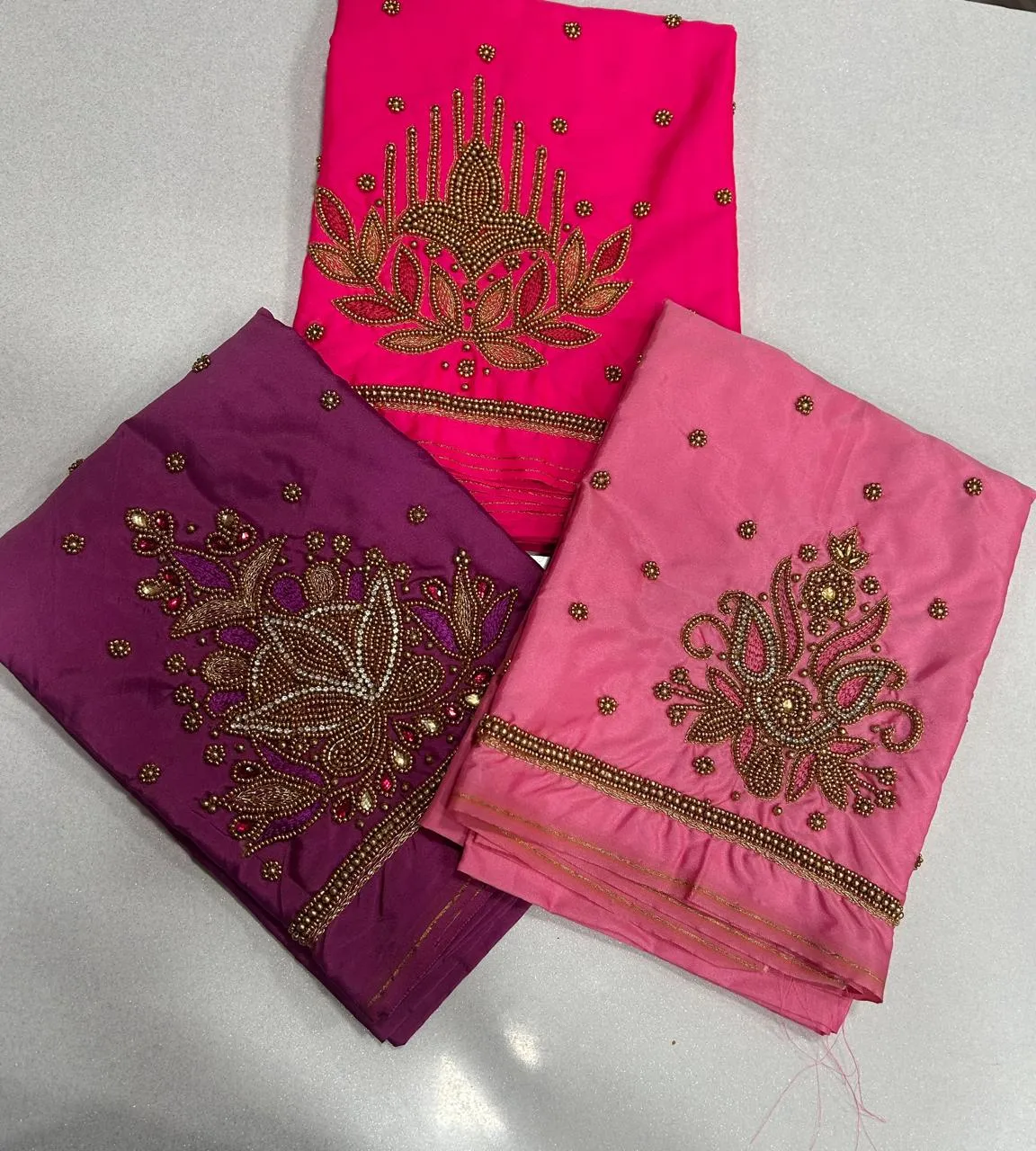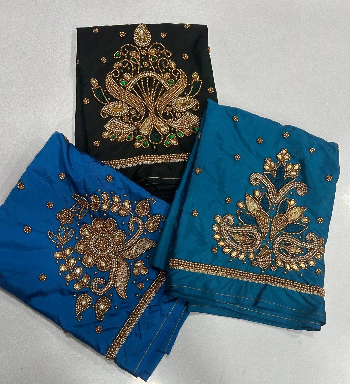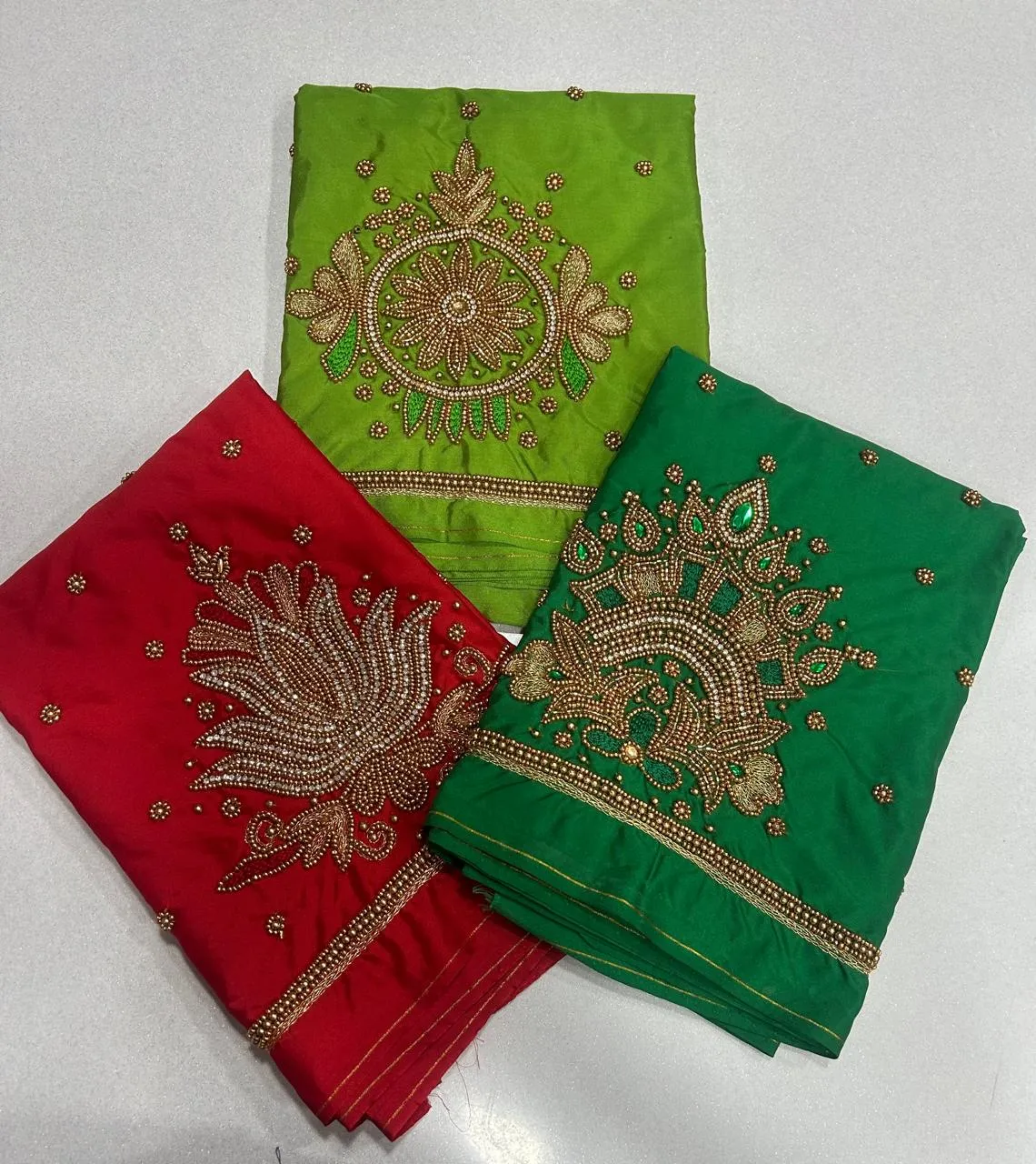 Stunning Raw Silk with Aari Work blouse. Crafted for wedding and festive wear, pairs beautifully with silk sarees and lehengas.