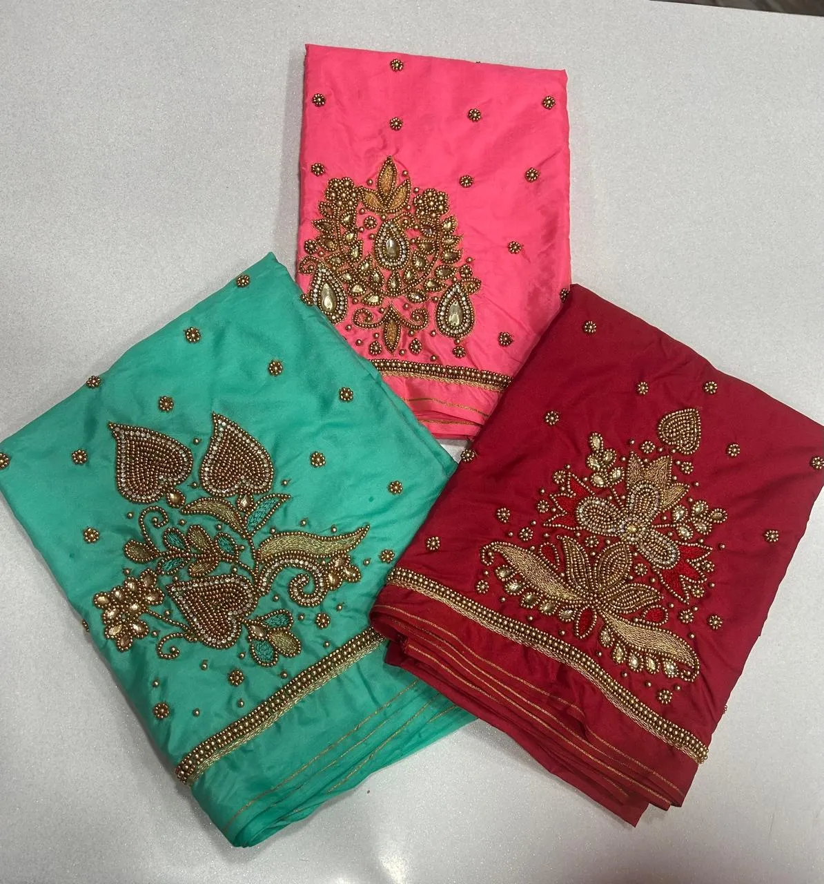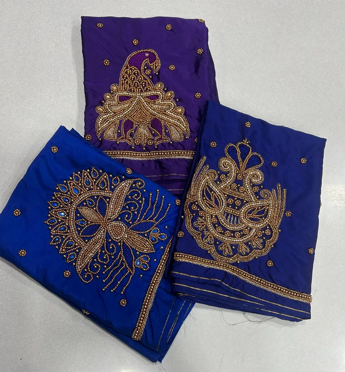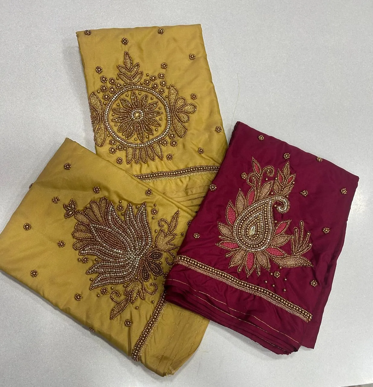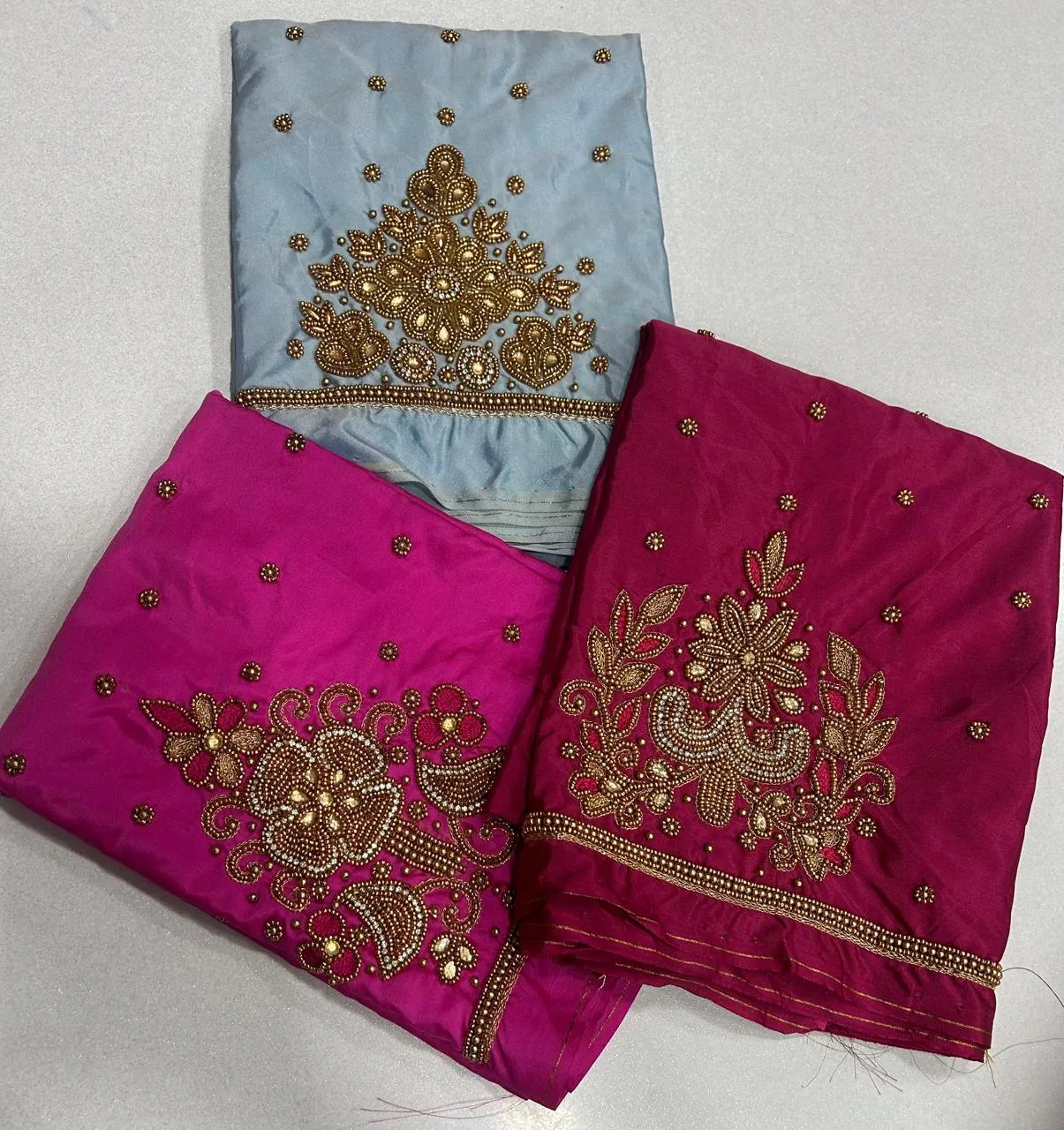 Stunning Raw Silk with Aari Work blouse. Crafted for wedding and festive wear, pairs beautifully with silk sarees and lehengas.