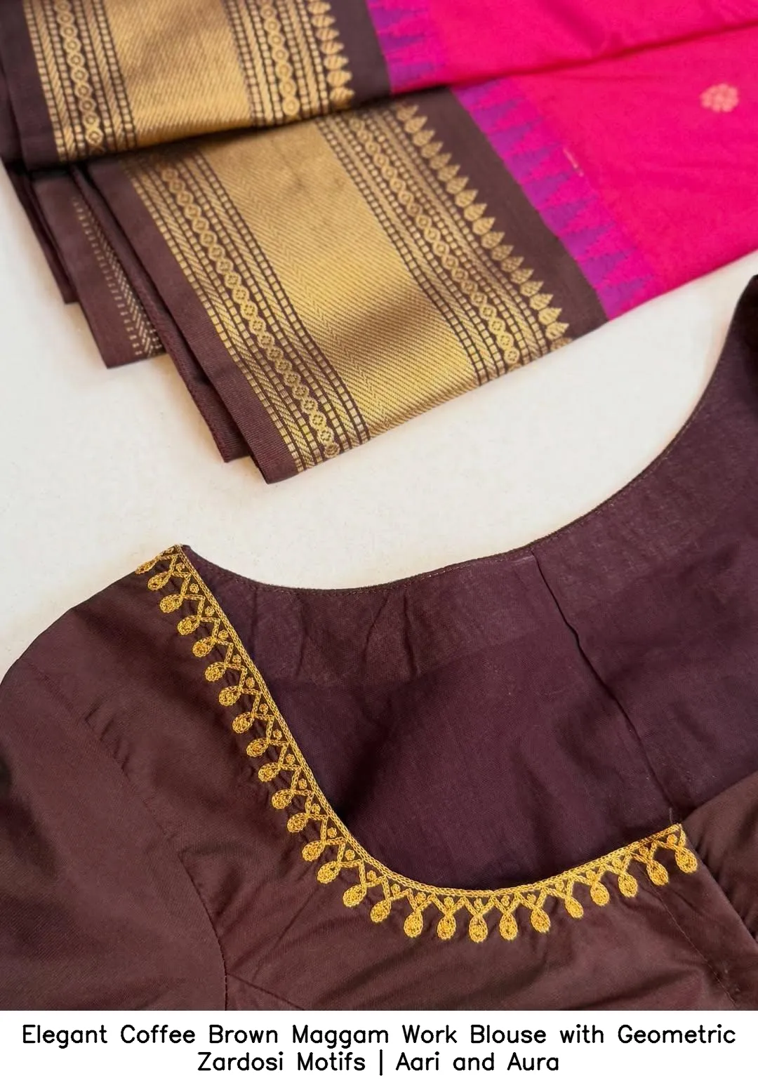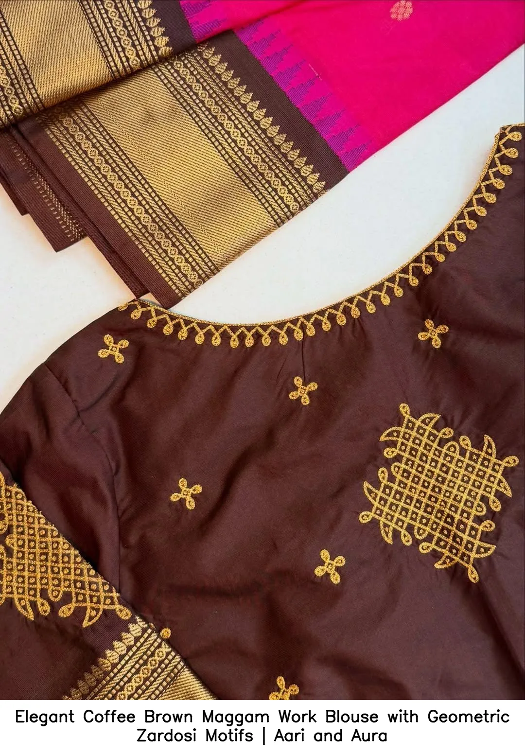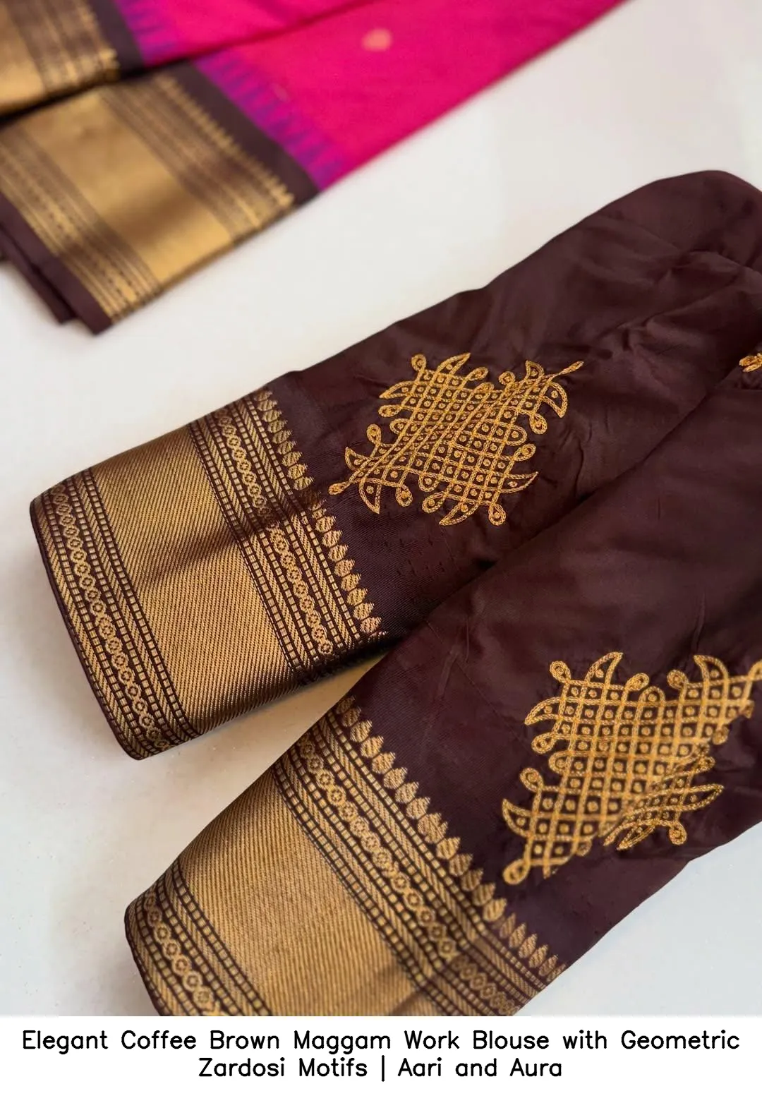 Product Name: Elegant Coffee Brown Maggam Work Blouse with Geometric Zardosi Motifs | Aari and Aura