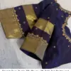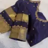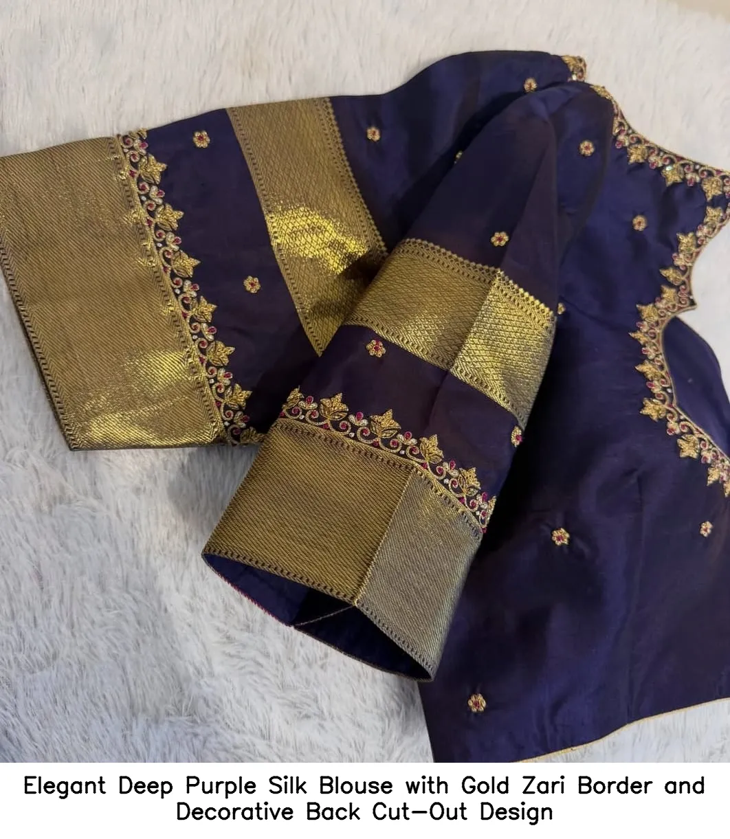 Product Name: Elegant Deep Purple Silk Blouse with Gold Zari Border and Decorative Back Cut-Out Design