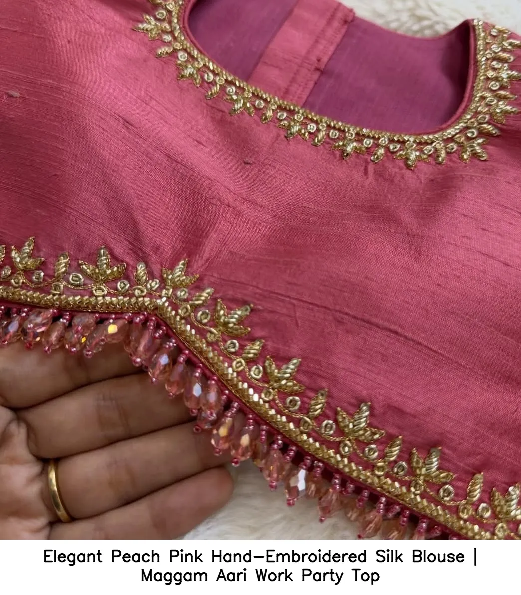 Elegant Peach Pink Hand-Embroidered Silk Blouse | Maggam Aari Work Party Top