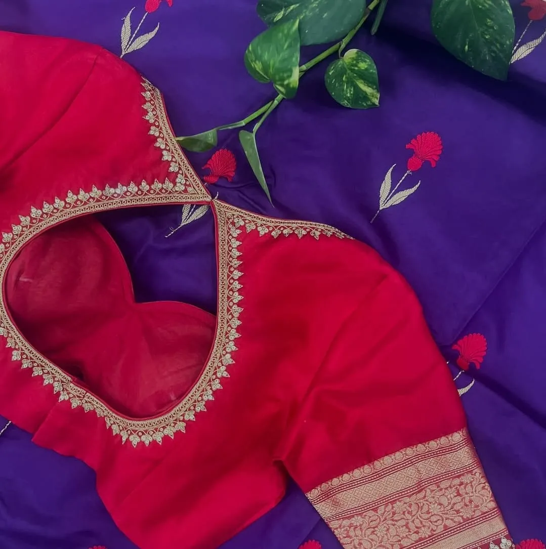 This exquisite blouse is made from high-quality raw silk and cotton fabric. It is available in sizes XL, XXL, and 3XL. You can choose from beautiful colors such as red, pink, blue, purple, and wine. To explore more options, browse our collection.