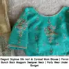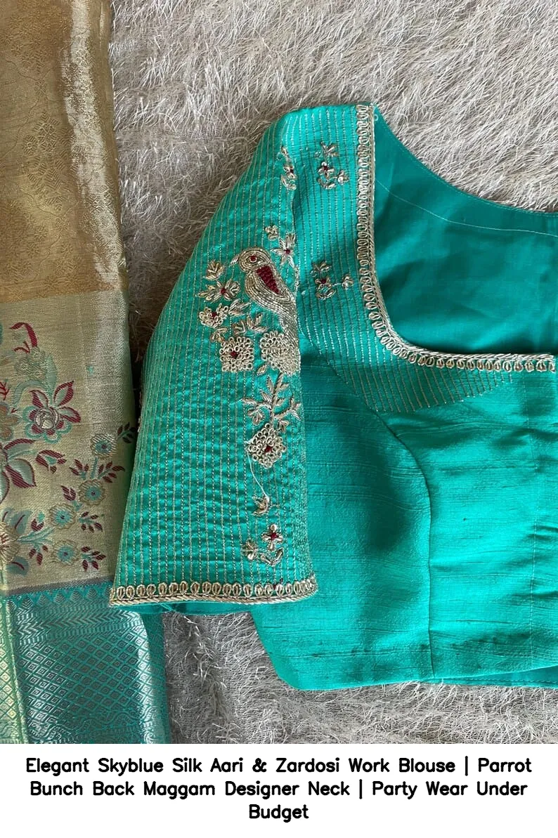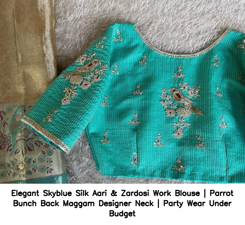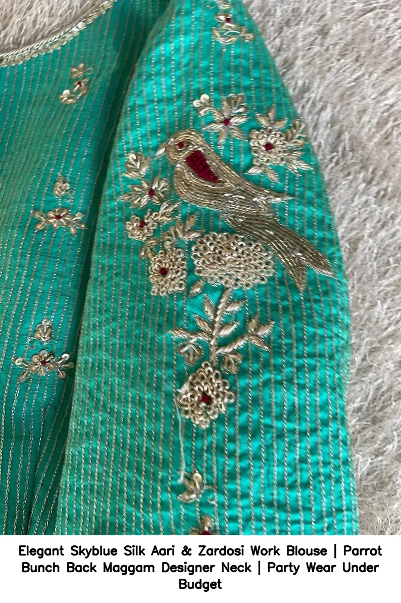 Product Name: Elegant Skyblue Silk Aari & Zardosi Work Blouse | Parrot Bunch Back Maggam Designer Neck | Party Wear Under Budget